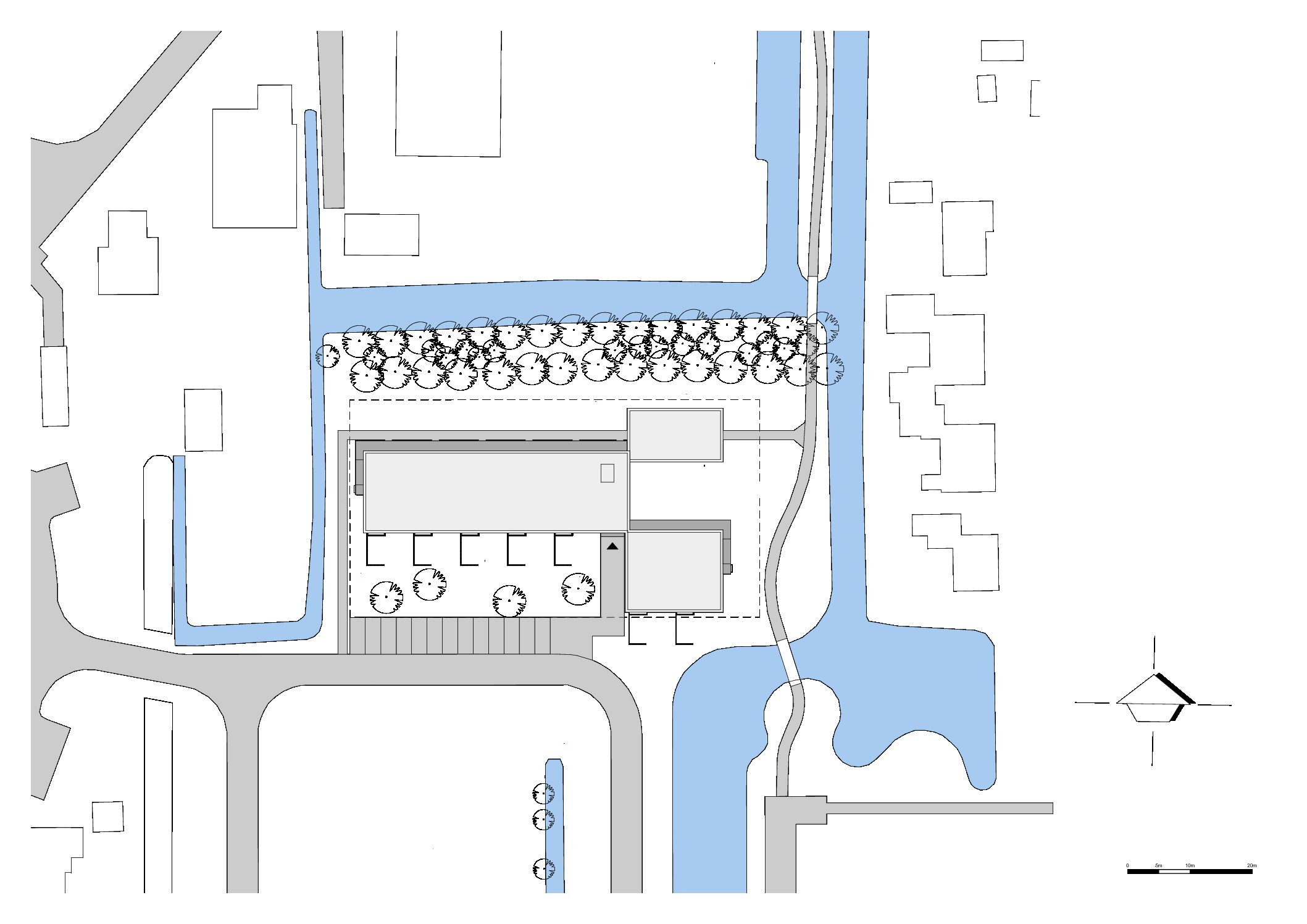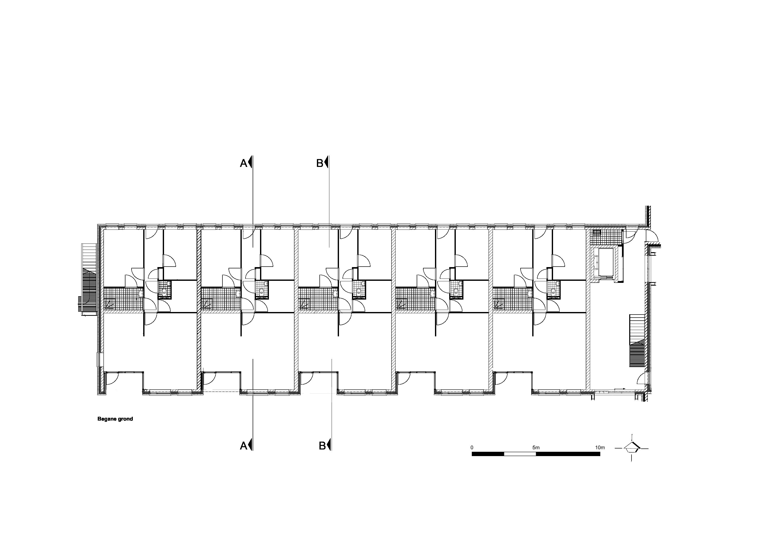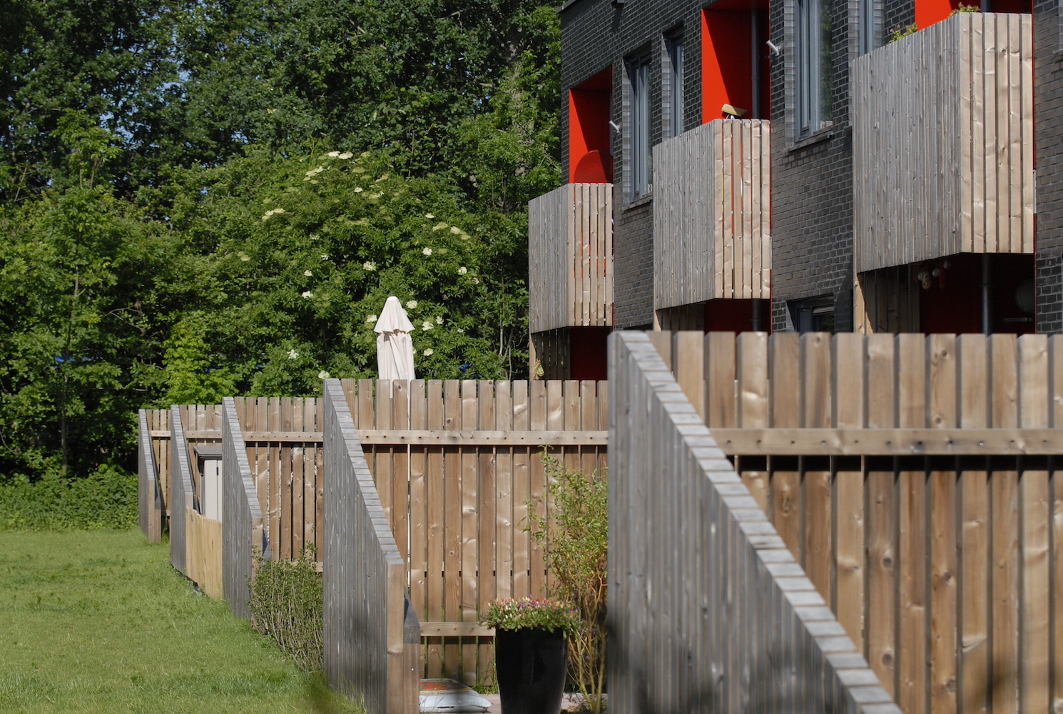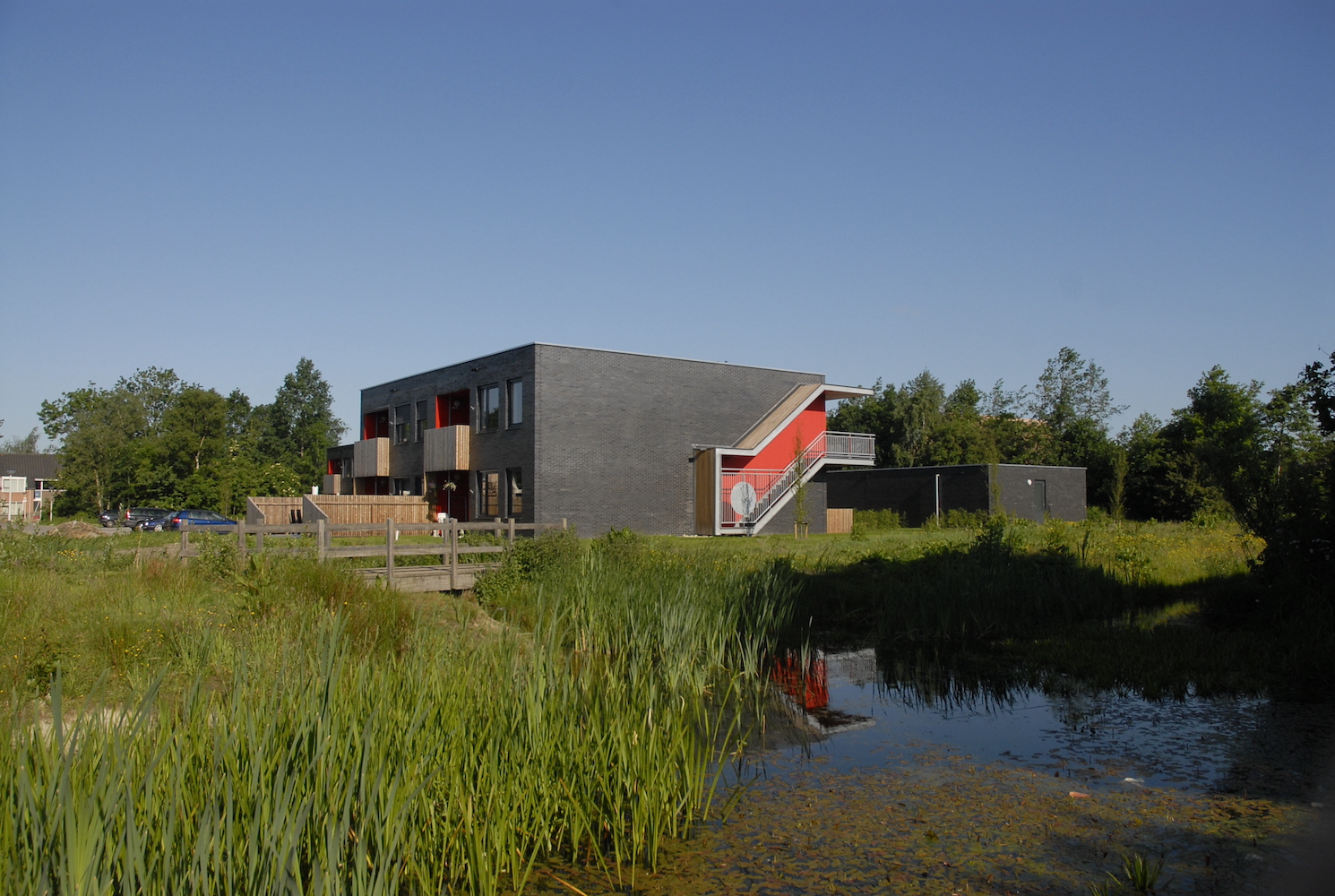 De andere tien woningen die geen oriëntatie op de vijver hebben, zijn naar achteren geplaatst zodat ze een grotere voortuin hebben met een grotere collectieve groenstrook ervoor. Door het gebouw iets hoger te leggen, kijken de woningen uit over deze strook en het trottoir. De voortuinen zijn op het zuiden georiënteerd. Aan deze zijde wordt ook het gebouw ontsloten. Door inkijk en rommeligheid door zelf getimmerde schuttingen te voorkomen aan deze voorzijde, is het houten hekwerk meegenomen in het ontwerp. Om eenheid te krijgen in het plan is dit houten hekwerk niet beperkt tot de begane grond, maar is ook het balkon van de verdieping op dezelfde manier gedetailleerd. Beide zijn met elkaar verbonden. Zo ontstaat tevens een visuele relatie tussen tuin en verdieping voor de bewoners: een tuingerichte beleving op de verdieping. Een verbrede galerij aan de noordzijde, ingesneden in het zwarte volume, biedt ruimte voor ontmoeting met de buren.
