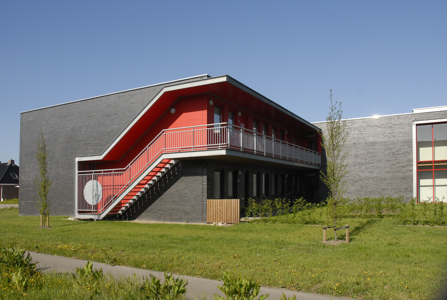 De zuidkant van Sumar kent een nieuw uitbreidingswijkje met voornamelijk vrije kavels. Tussen het dorp en deze uitbreiding hebben we in opdracht van WoonFriesland een gebouw van 14 appartementen gerealiseerd. De hoofdentree is logisch in het verlengde van de toegangsweg geplaatst, iets uit het midden. Deze entree knipt het gebouw daardoor in twee delen, zodat de vorm van de kavel volledig benut wordt. Het gebouw krijgt een soort ‘kop’ van 4 woningen uitkijkend op een vijverpartij doorkruist door een openbaar fietspad.