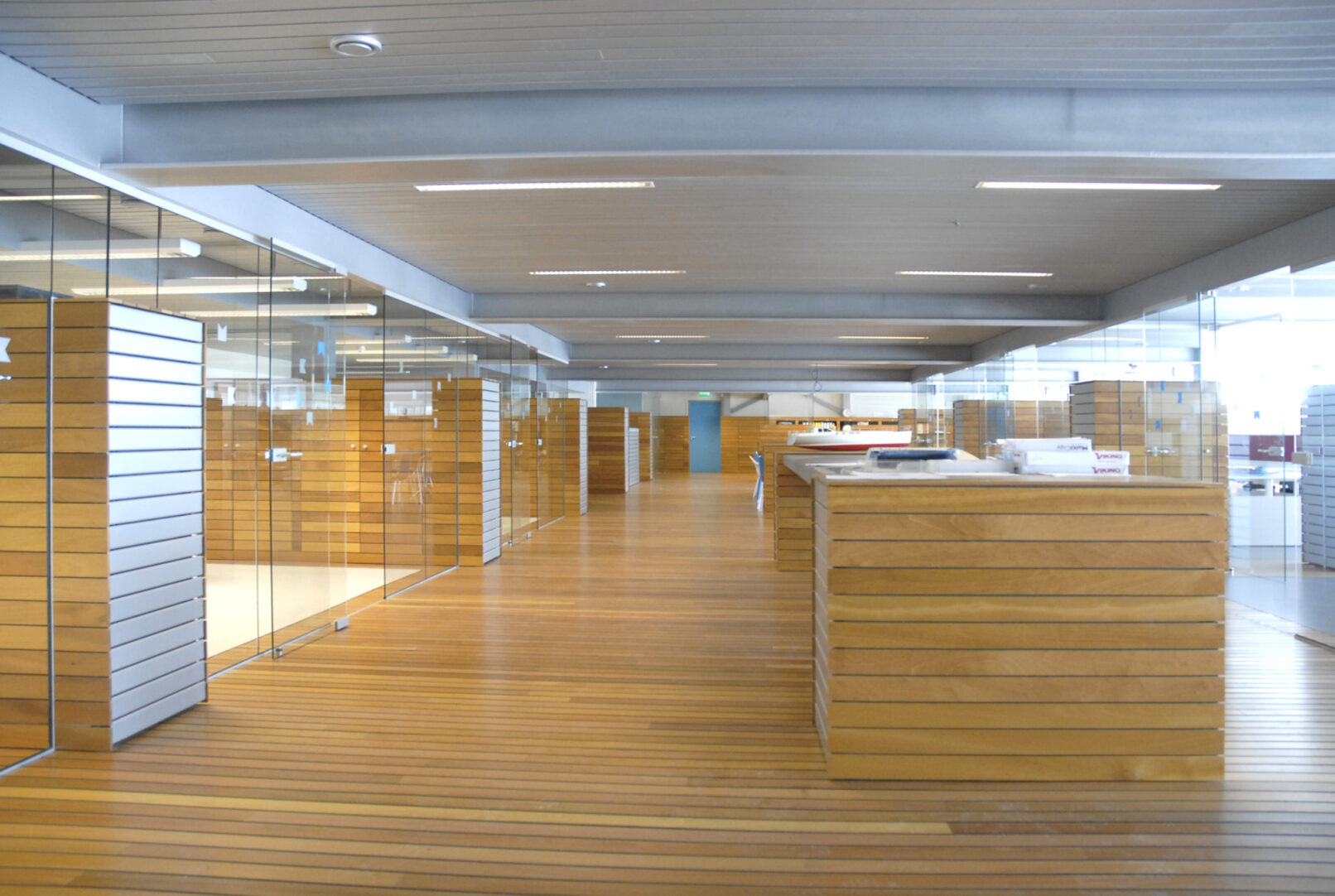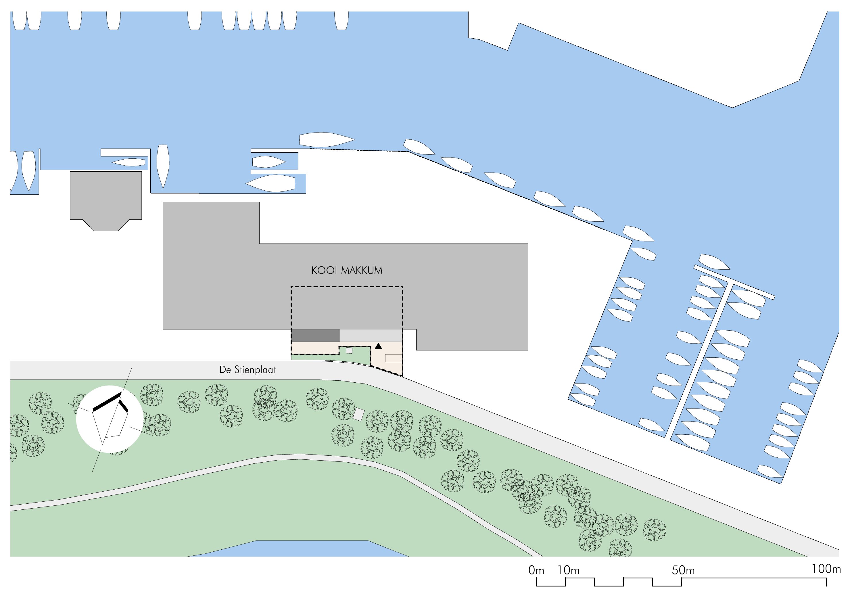Kooi Makkum is een moderne jachtwerf die jachten bouwt van de hoogste kwaliteit. Ze bouwen aluminium custom-built zeiljachten, met een houten afwerking. Het voormalige pand was geen affiche van het bedrijf. Een eenvoudige loods met kleine ramen en kunststof deuren werkte afschrikwekkend. De werkvertrekken waren donker en de entreehal had weinig allure. Achterbosch Architectuur is gevraagd om hier wat aan te doen.