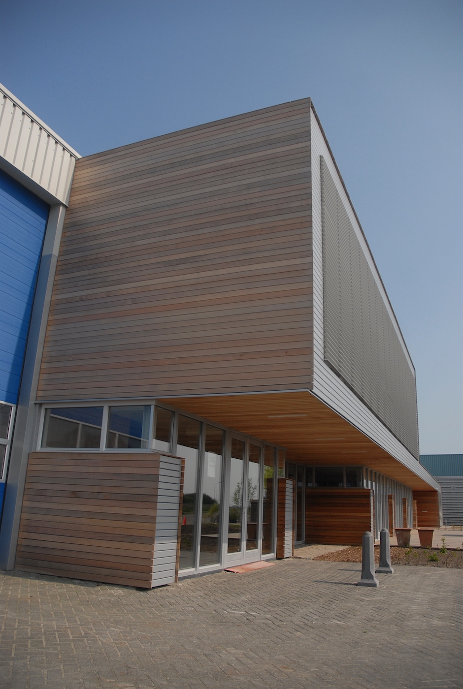 Er is gebruik gemaakt van de materialen waarmee Kooi het liefste werkt: aluminium en hout. Hout vormt de bekleding van het nieuwe interieur, terwijl open en gesloten aluminium lamellen het gevelbeeld bepalen. De houten vloer loopt als een steiger door naar buiten en vormt het voorplein. Houten kasten scheiden de werkplekken van elkaar. Door deze buiten de gevel te steken, wordt de hoofdstructuur van het gebouw afleesbaar aan de buitenzijde. Hierdoor wordt een prettige menselijke maat ervaren. Aluminium lamellen lopen voor een deel voor de oude gevel langs op de verdieping om een evenwichtig beeld te genereren. Hier loopt het materiaal pragmatisch voor de bestaande kozijnen langs en wordt daglichtsturend en zonwerend ingezet.