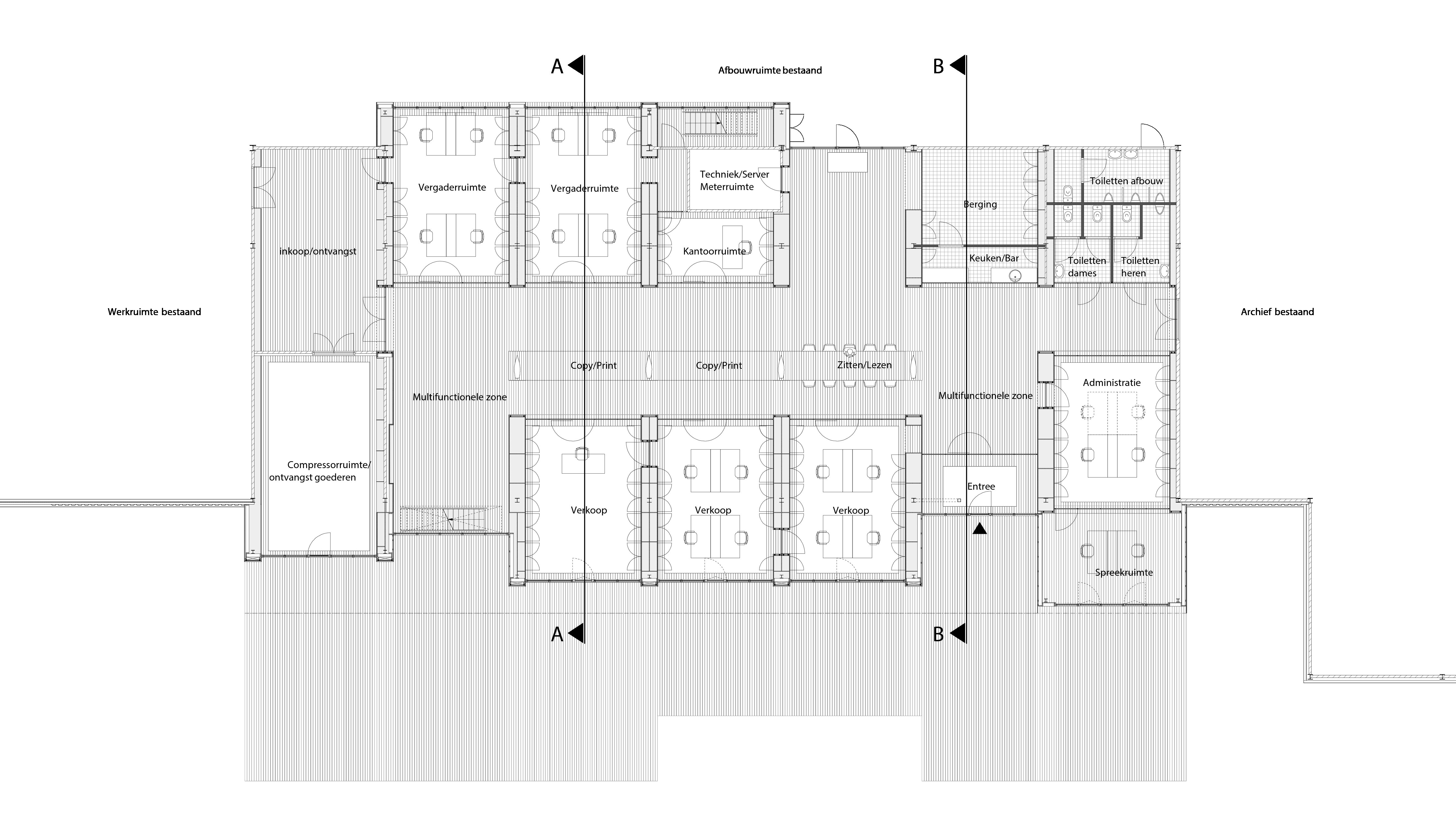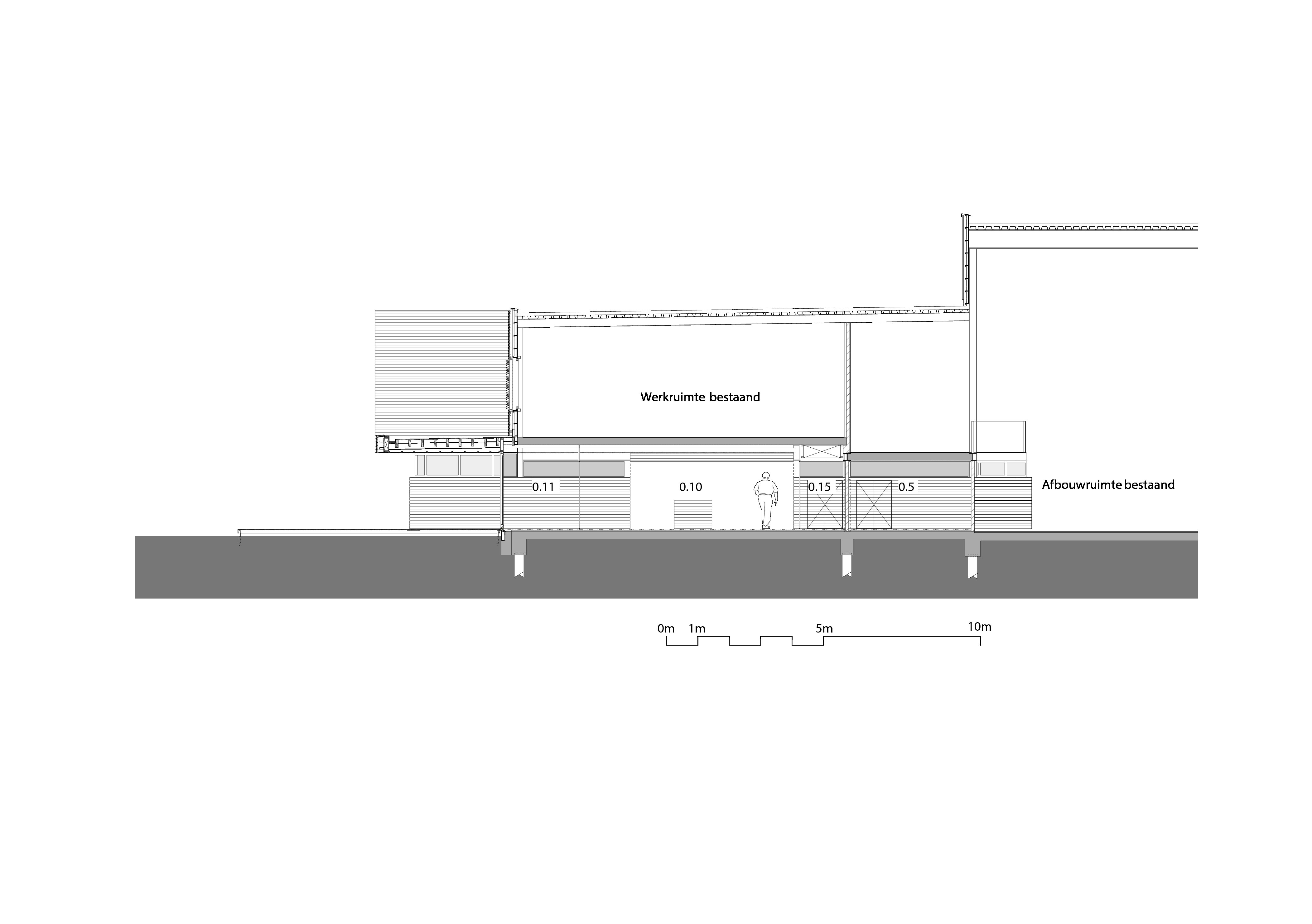 We hebben een deel van de loods intact gelaten, waar deze nog goed functioneerde. Alleen het kantoor heeft een transformatie ondergaan en op de verdieping is een vergaderruimte toegevoegd met uitzicht over een natuurgebied. De volledige gevel, ter breedte van de kantoorvleugel, is gesloopt. Een nieuw volume is in de bestaande massa ‘geschoven’.