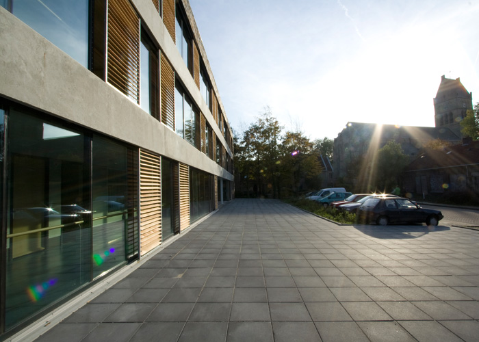 Aan de stadszijde van het gebouw bevindt zich de hoofdentree. De entrees van de woningen zijn bereikbaar vanuit de centrale corridor die een open uitstraling heeft en georiënteerd is op de binnenstad. Het hout van de parkzijde komt afwisselend terug in de verschuifbare houten zonneschermen die aan de gevel bevestigd zijn. De stedelijke zijde van het woongebouw biedt een rustig beeld door de betonnen borstweringen die de horizontaliteit van het gebouw benadrukken. Een allesomvattend kader, uitgevoerd in natuurstenen leien, verbindt de stadskant met de parkzijde en accentueert de vertrappende beweging van het blok. Daarnaast refereert de toegepaste gemêleerde leisteen aan de Martinikerk om de hoek, die een prominente plek inneemt de binnenstad van Bolsward.