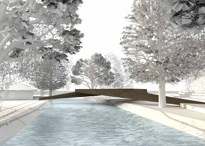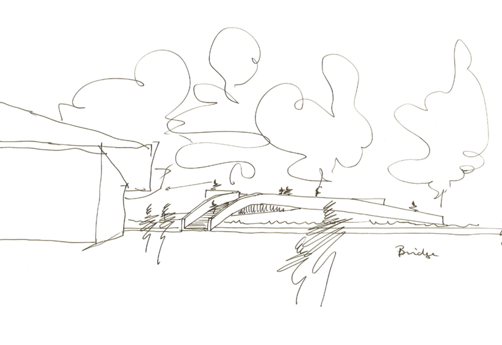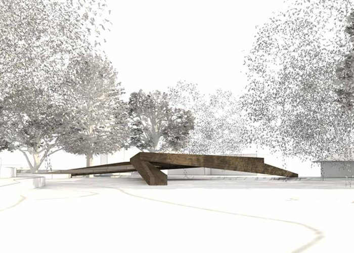 Deze routes hebben we letterlijk in de brug tot uitdrukking gebracht door drie uitvergrote abstracte ‘boomstammen’ met elkaar te verbinden in drie richtingen. Door de ‘boomstammen’ afwisselend boven en onder elkaar te plaatsen houden ze elkaar in evenwicht. Een stabiele driehoekige vorm als basis voor een brug die als ontmoeting, wandel, fiets en uitzichtplek dienst doet. De gehele brug wordt uitgevoerd in accoyahout.