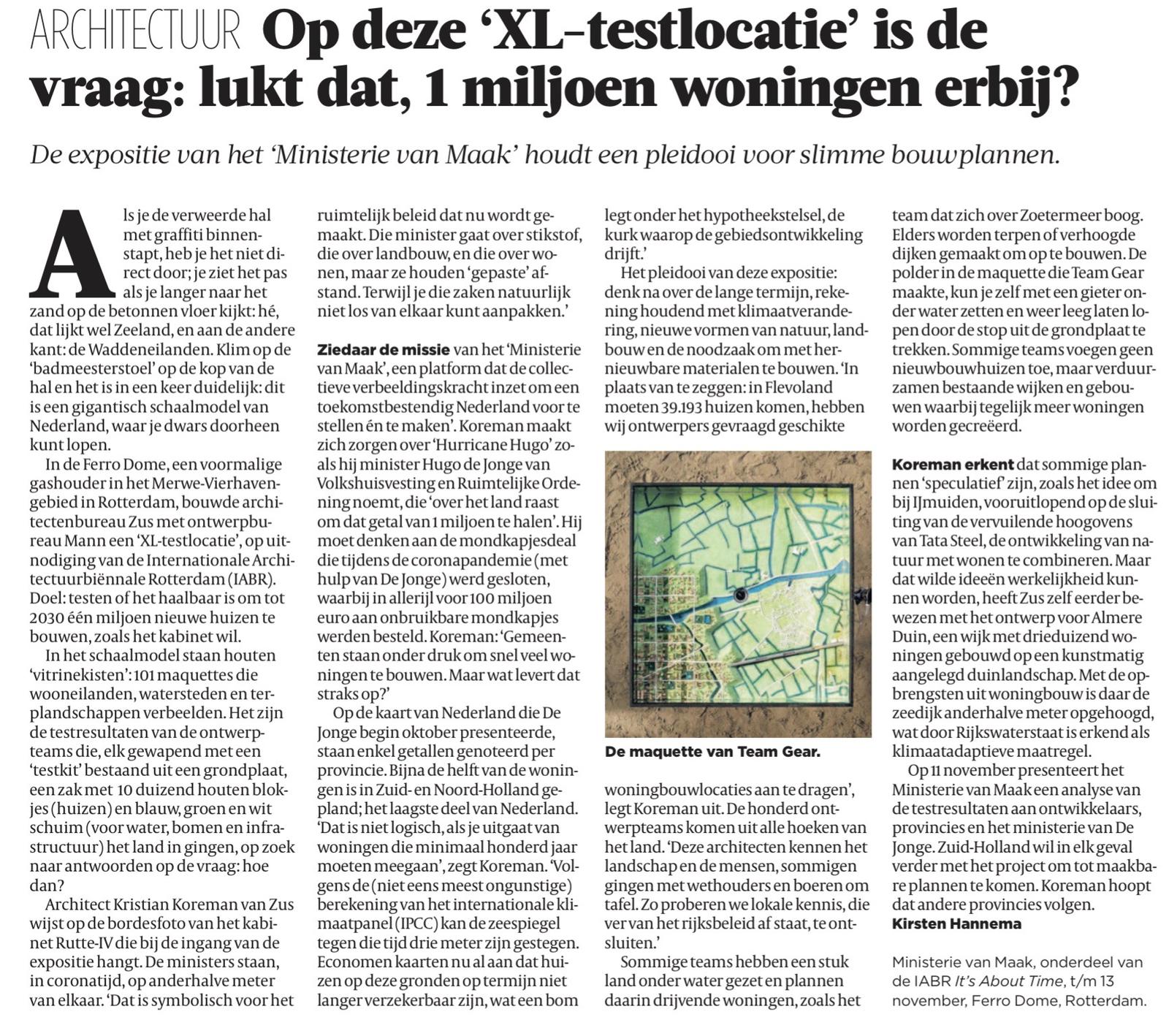 Dit begint bij het toekomstbestendig inrichten van Nederland met een miljoen extra woningen de komende tien jaar. Het Ministerie van Maak wil samen met 100 geselecteerde ontwerpers op 100 plekken van 4 km2 in Nederland een voorzet doen voor toekomstbestendige inrichting om samen inzicht te geven hoe een miljoen woningen gerealiseerd zouden kunnen worden.