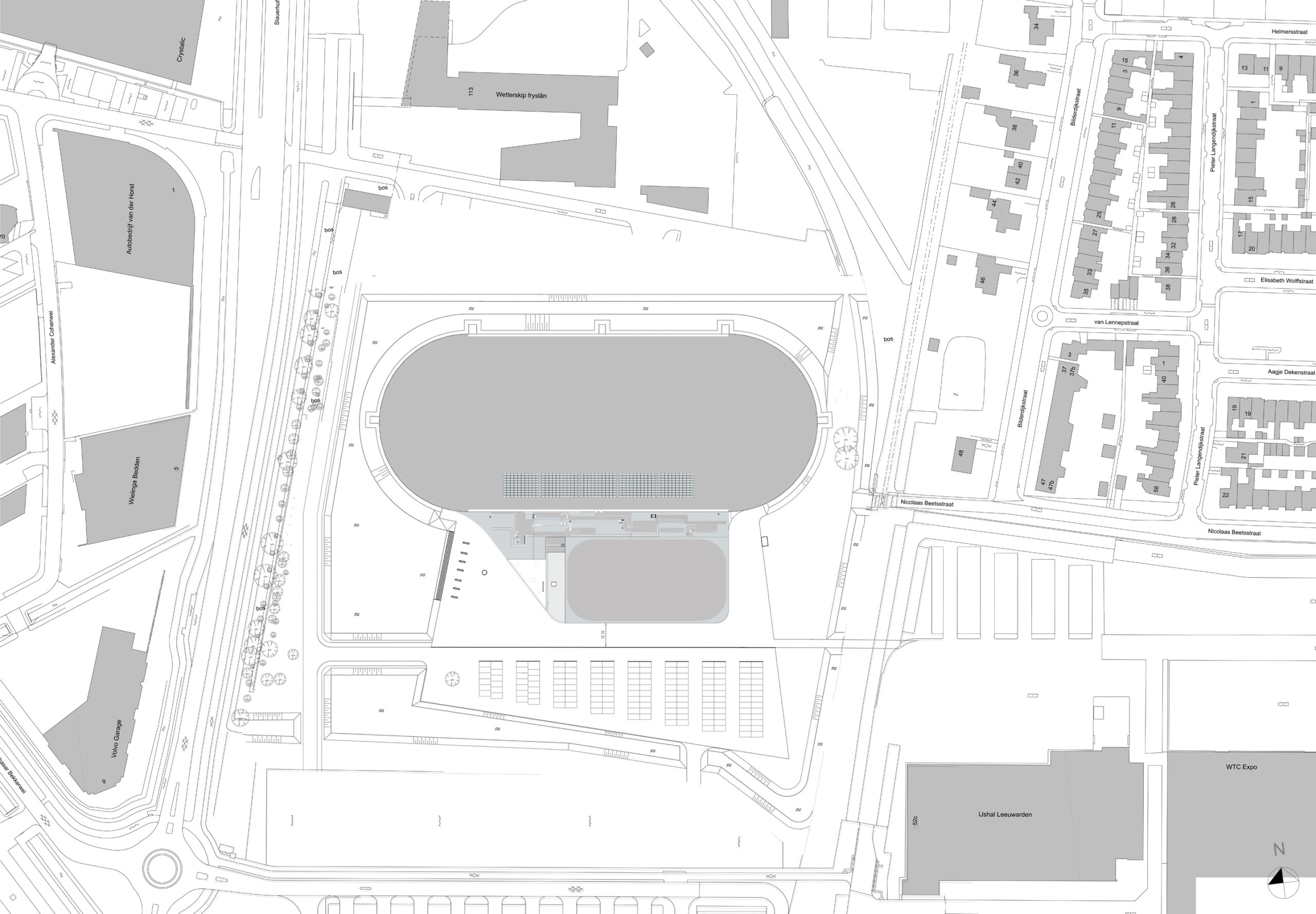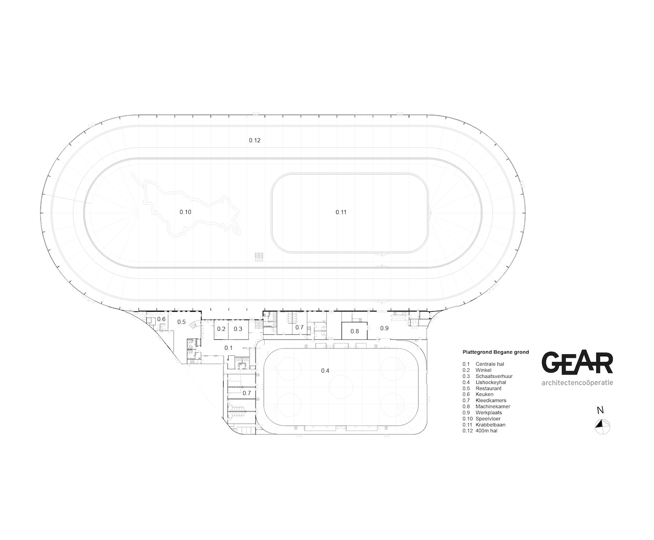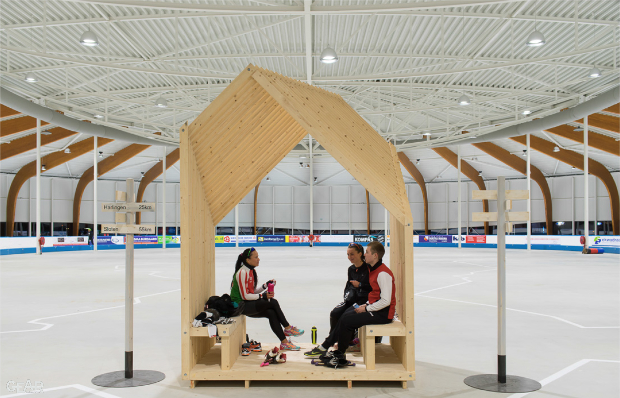 Zoals een bevroren sloot door het vlakke land vloeit, zo volgt de gevel op een natuurlijke en pragmatische manier het functionele programma. Op de gevel zijn lichtstrepen aangebracht als krassen op het ijs. De gevel barst als een ijsschots open op plekken waar licht en zicht gewenst zijn. Het dak dekt de ijshal af als een winterse sneeuwdeken over het land. Aan de buitenzijde loopt het maaiveld als een dijkje op tot de onderzijde van de raamstroken.