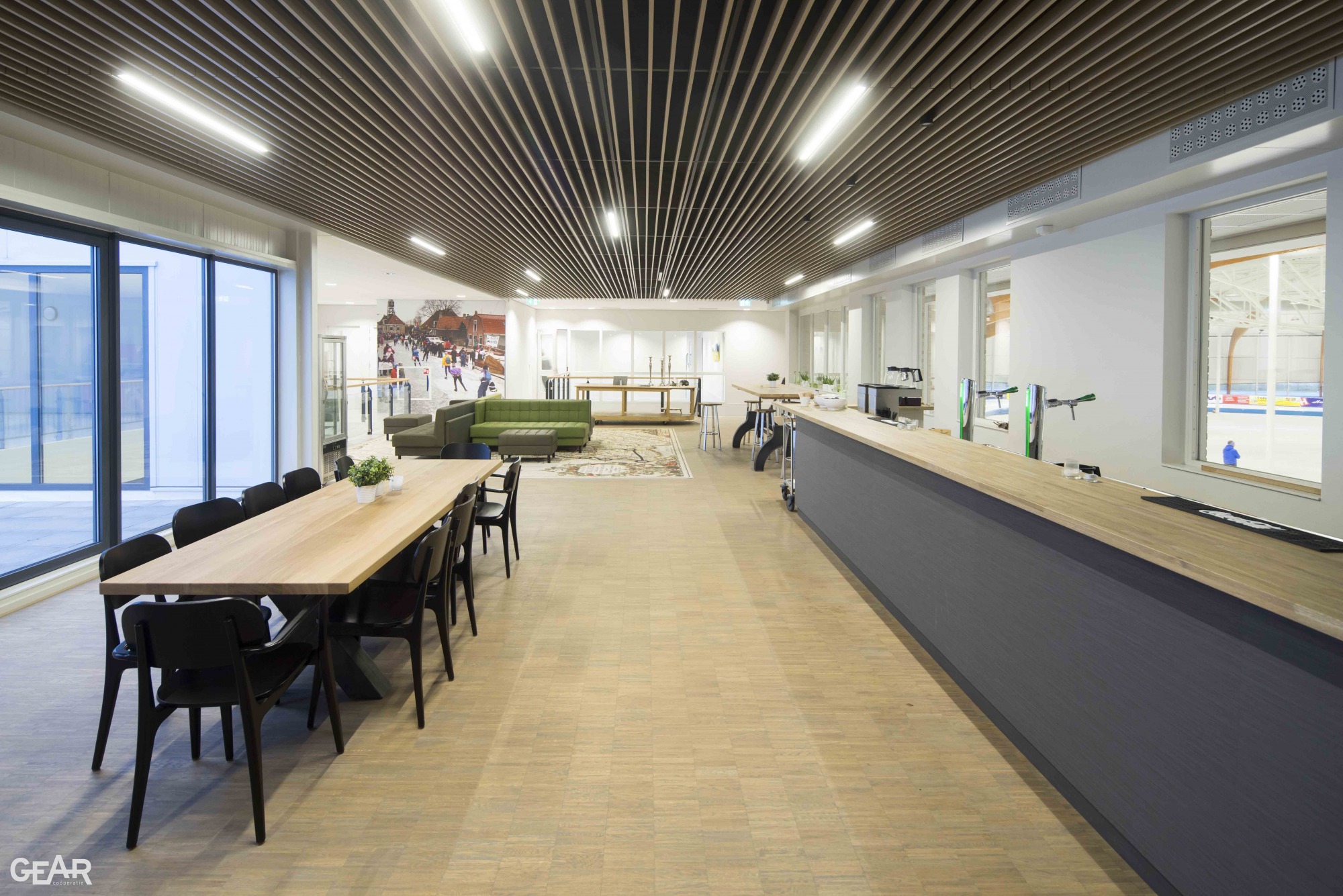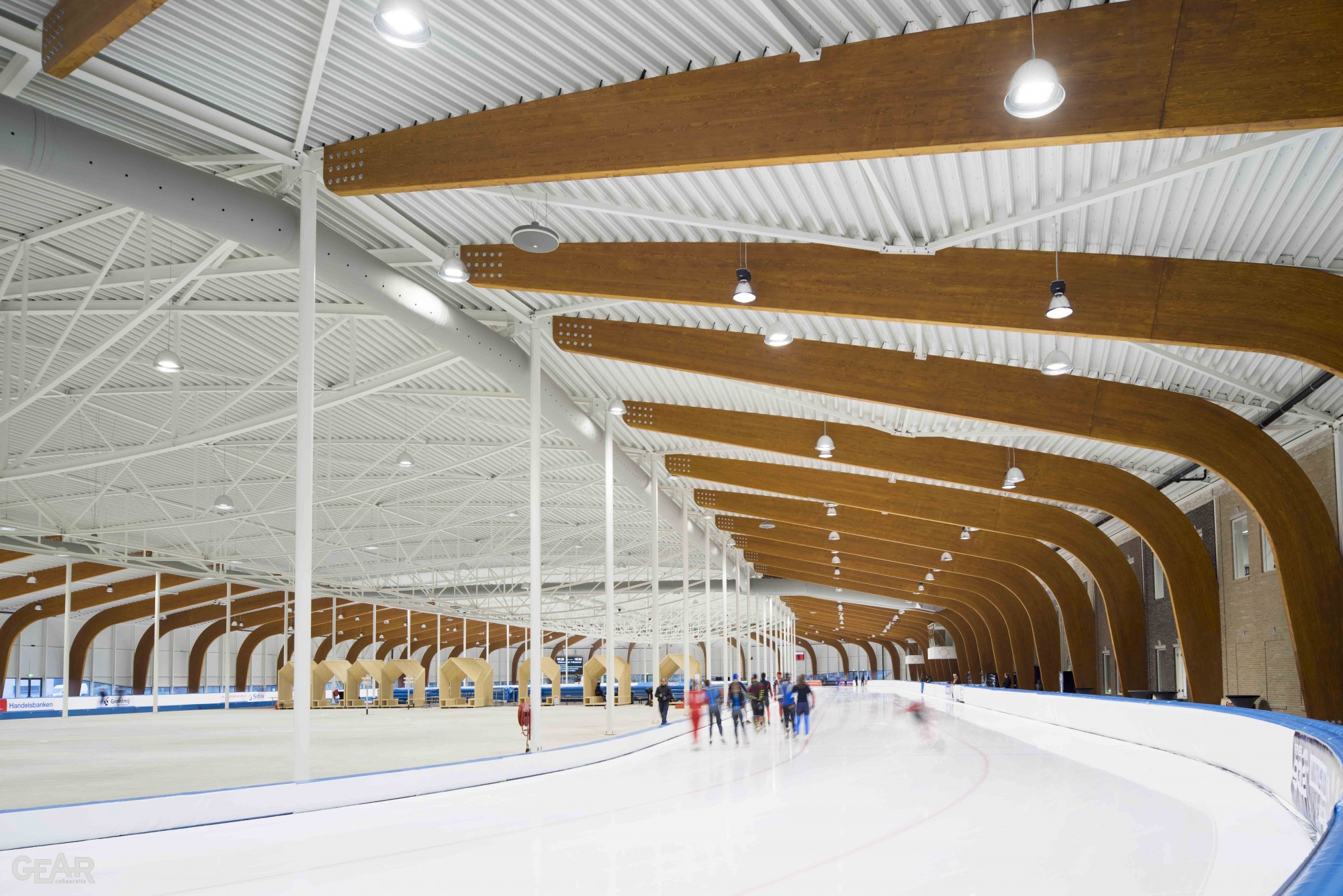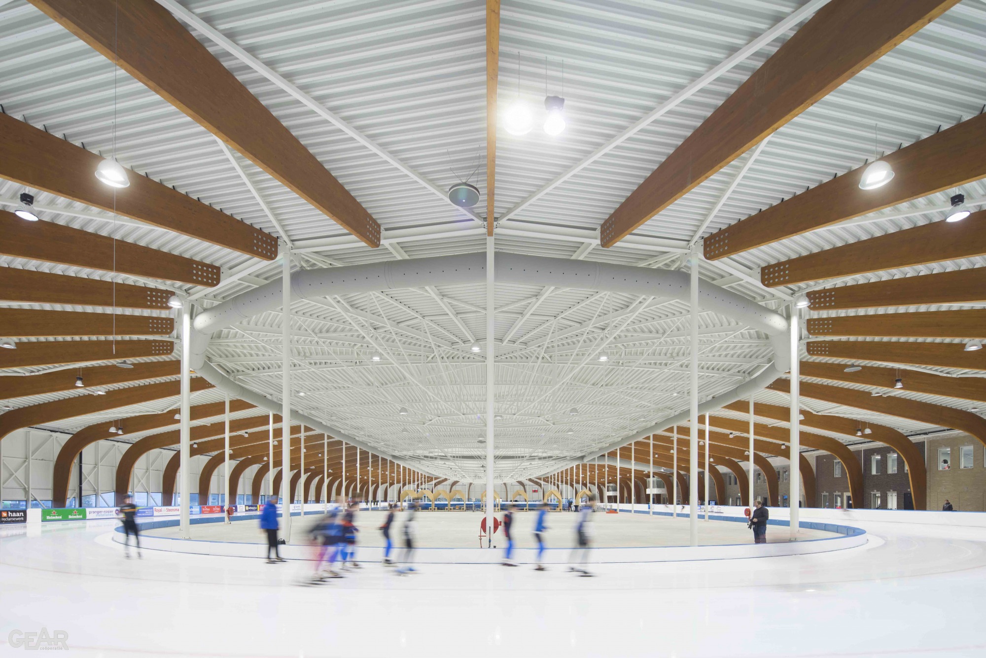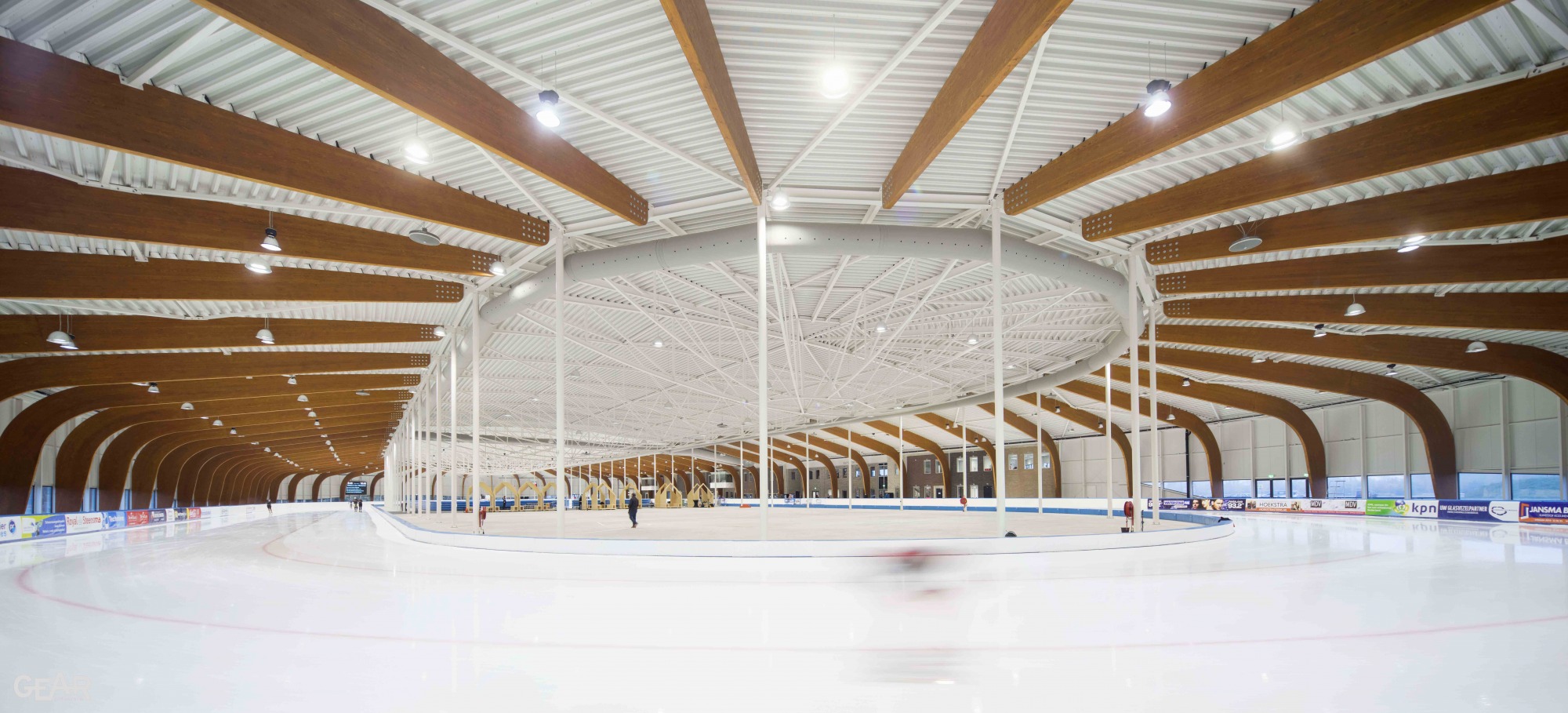 Van binnenuit beleef je het landschap op ooghoogte, zoals je dit ook ervaart al schaatsend over de Friese wateren waar de weilanden hoger liggen dan de sloot. Op strategische plekken is het glas opgetild zodat men zicht krijgt op bijzondere plekken in de stad. Bij iedere ronde bereik je de facilitaire zone met horecagelegenheid, die als een Fries stadje is vormgegeven. Ornamenten met het motief van het Elfstedenkruisje zijn als sluitstenen in het metselwerk opgenomen.