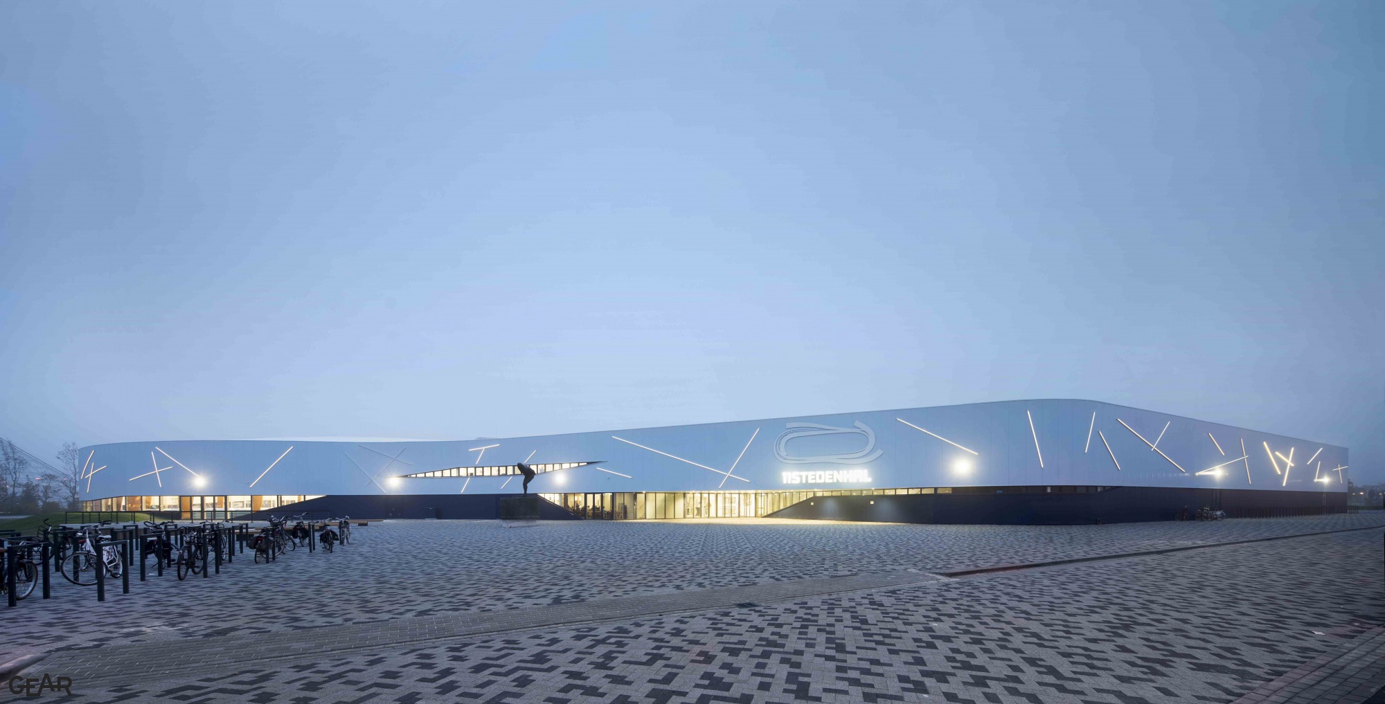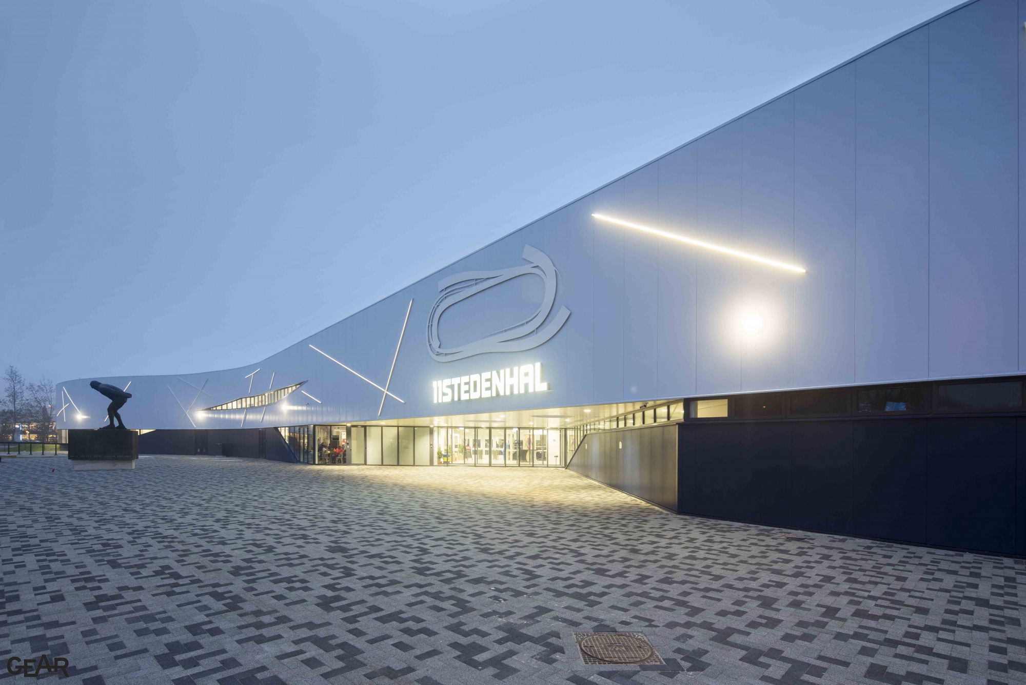 Het bijzondere aan dit gebouw zit vooral in het gewone. Deze kwaliteit is ook terug te vinden in de identiteit van het Friese landschap, die niet gekenmerkt wordt door extremen, maar waar iedere kleine slinger in de weg een nieuw perspectief biedt. Vanaf het ijs is dit goed waarneembaar. De Elfstedenhal verbeeldt deze essentie en refereert hier op verschillende manieren aan. De gevel, duurzaam, doelmatig en passend bij de achterliggende functie, is gelaagd opgebouwd uit aluminium en glas.