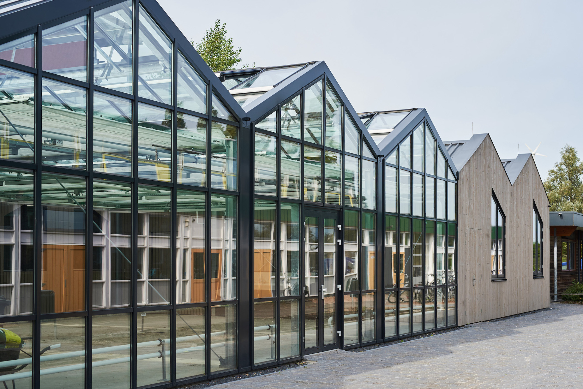 Die basis vraag heeft geresulteerd in een nieuw bouwvolume dat zich ‘nestelt’ op de plek, en een waarachtig bijna vanzelfsprekende verbinding en nieuwe entree vormt voor de studenten en docenten. Opgetrokken uit houten verticale geveldelen, en grotendeels biobased materialen, verwerft de nieuwbouw haar eigen plek, met een geheel eigen unieke identiteit. De nieuwe entree, tevens kantine, ontmoetingsplek en een plek om te studeren verbindt zich met een fraai nieuw kassencomplex. De eenheid is weer in balans en creëert op een eenvoudige en toch vanzelfsprekend manier rust en eenheid.
