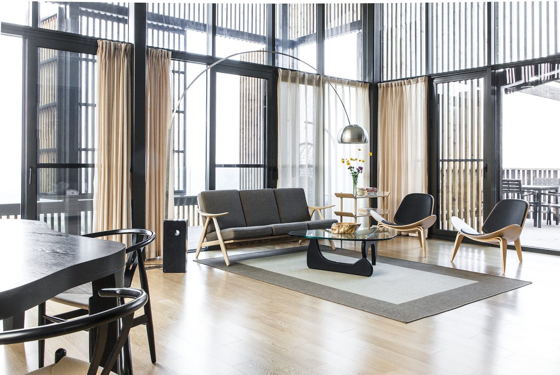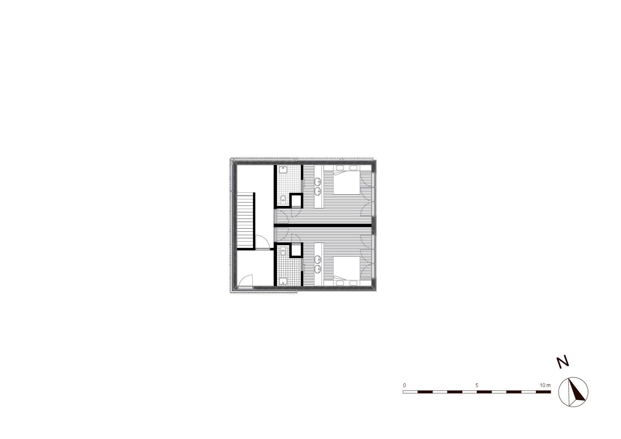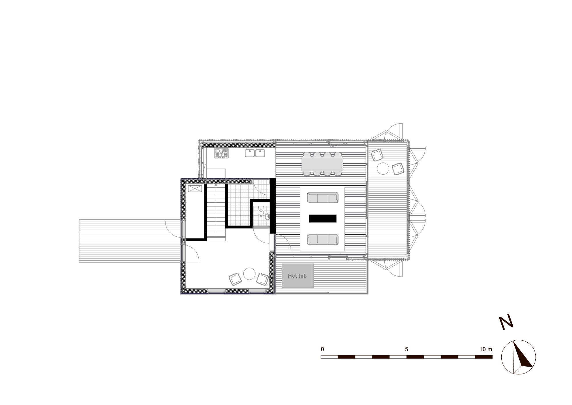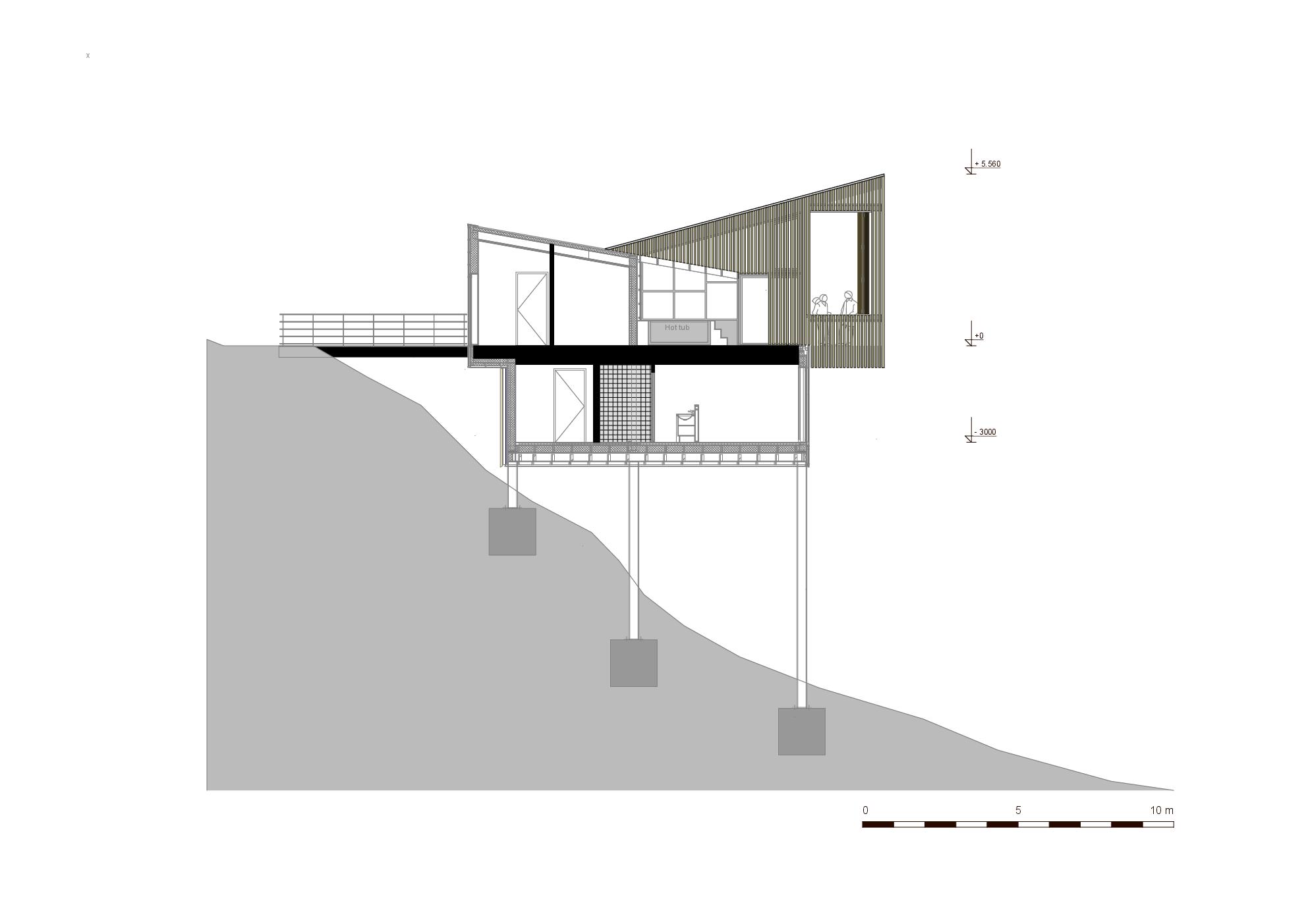 De zwevende uitkragende volumes zijn met lokaal hout bekleed. Het woningen draaien voor een groot deel op de verbranding van houtsnippers en elektriciteit afkomstig van zonnepanelen.