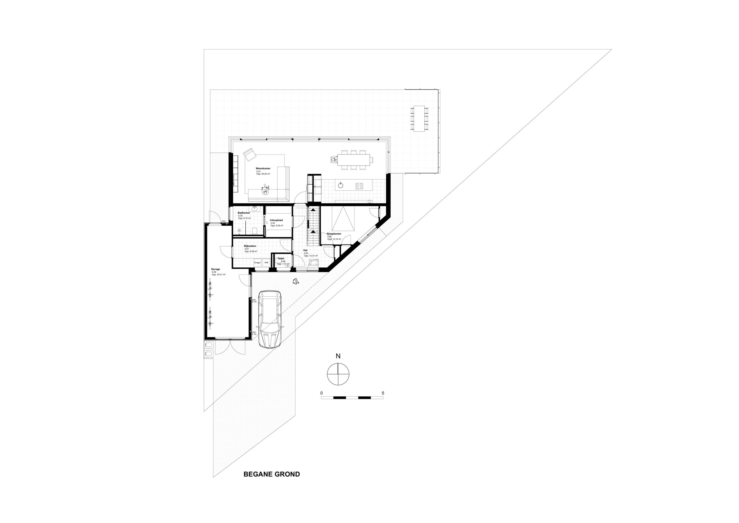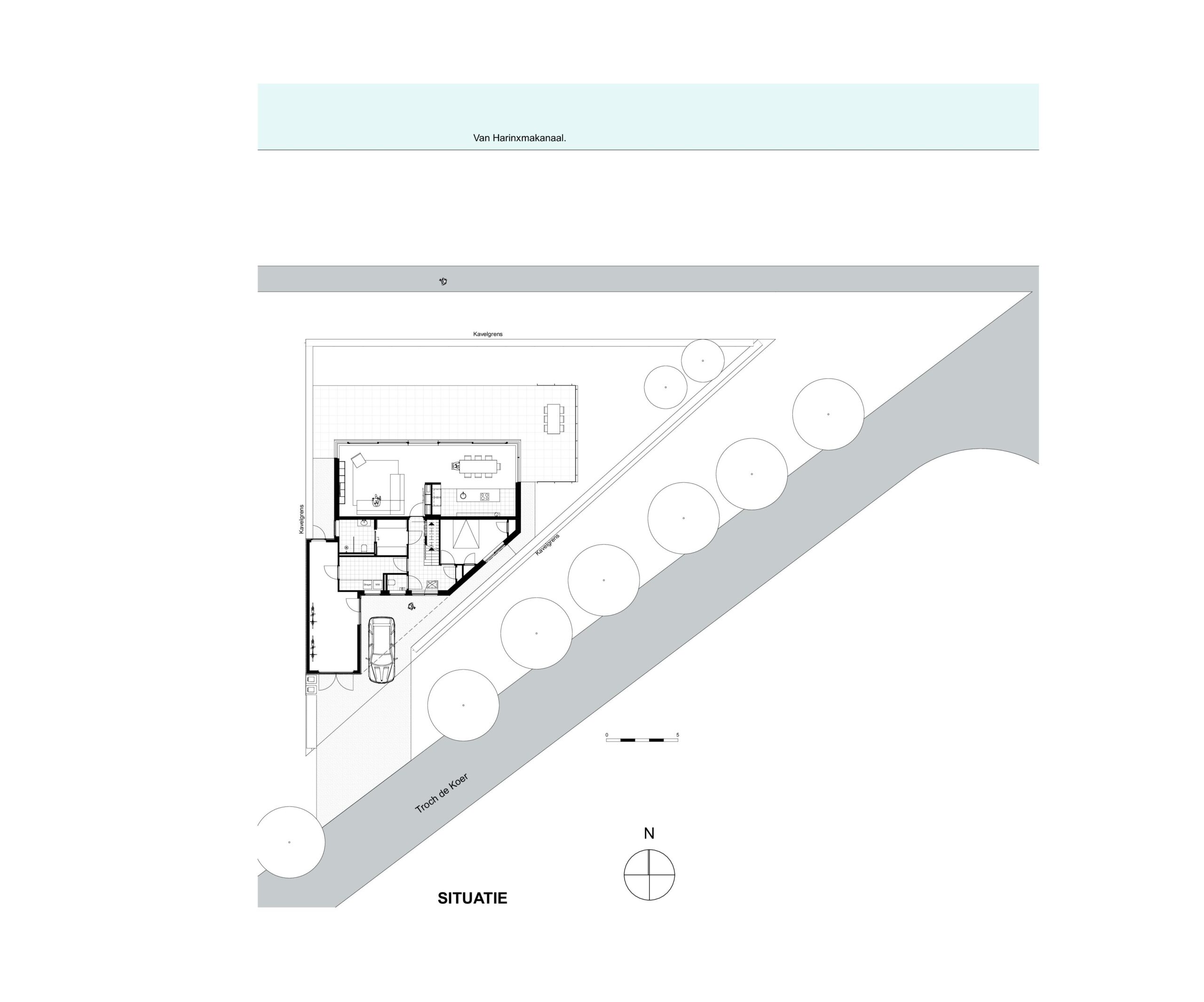 De woning is fraai gelegen langs het Van Harinxmakanaal in Deinum. De hoofdvorm van de woning is eenvoudig en markant en voorzien van een zadeldak. De locatie echter biedt mogelijkheden en kansen voor een fraai terras, een groots uitzicht op het kanaal, en de woning ook te verbinden met een garage/carport. Hierdoor meandert de woning op de locatie, en vervormt daarmee in de plattegrond en de gevels, daar waar dat gewenst is. Hierdoor ontstaat een unieke vorm, heel locatie specifiek en toch vertrouwd en herkenbaar.