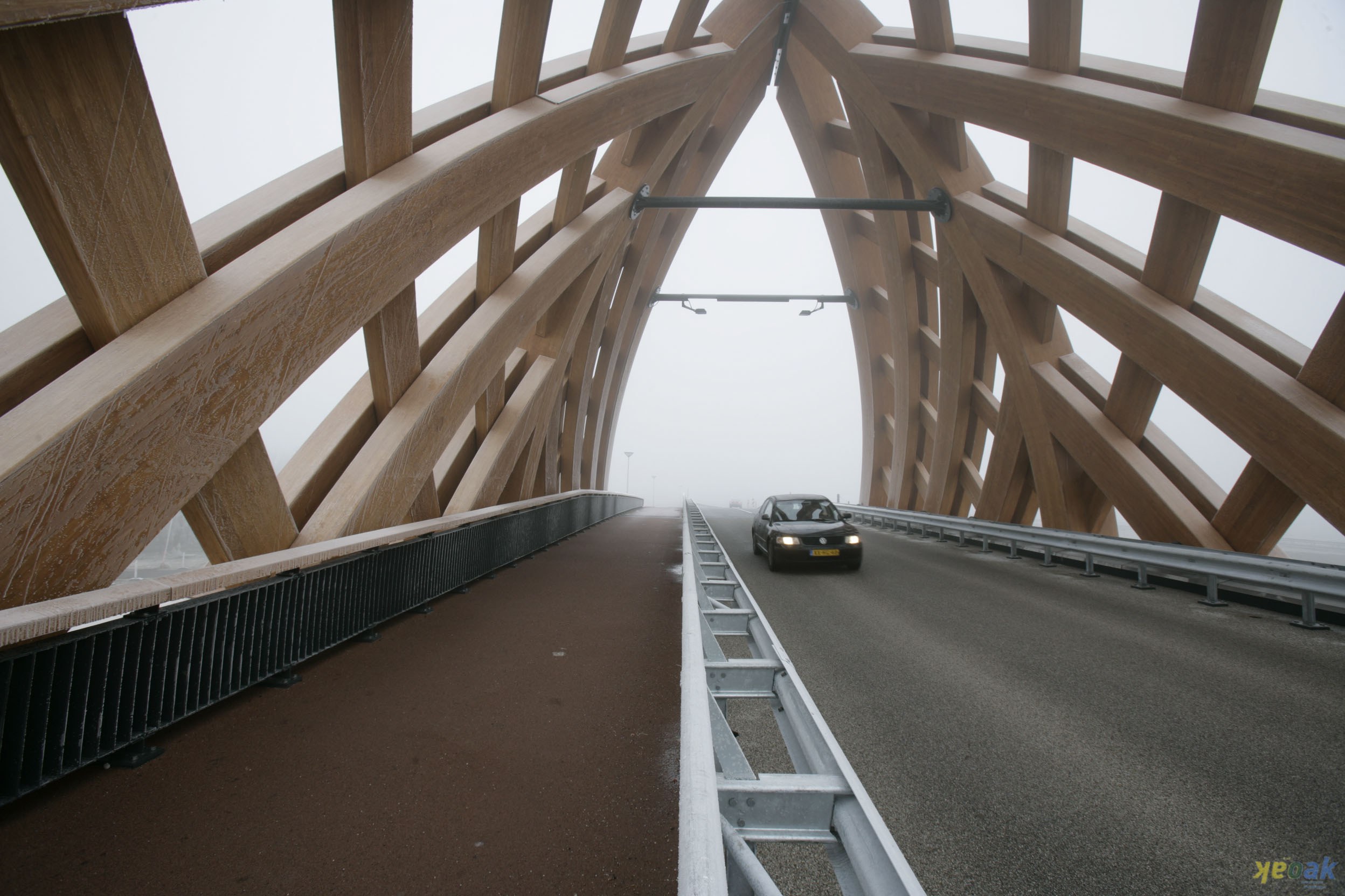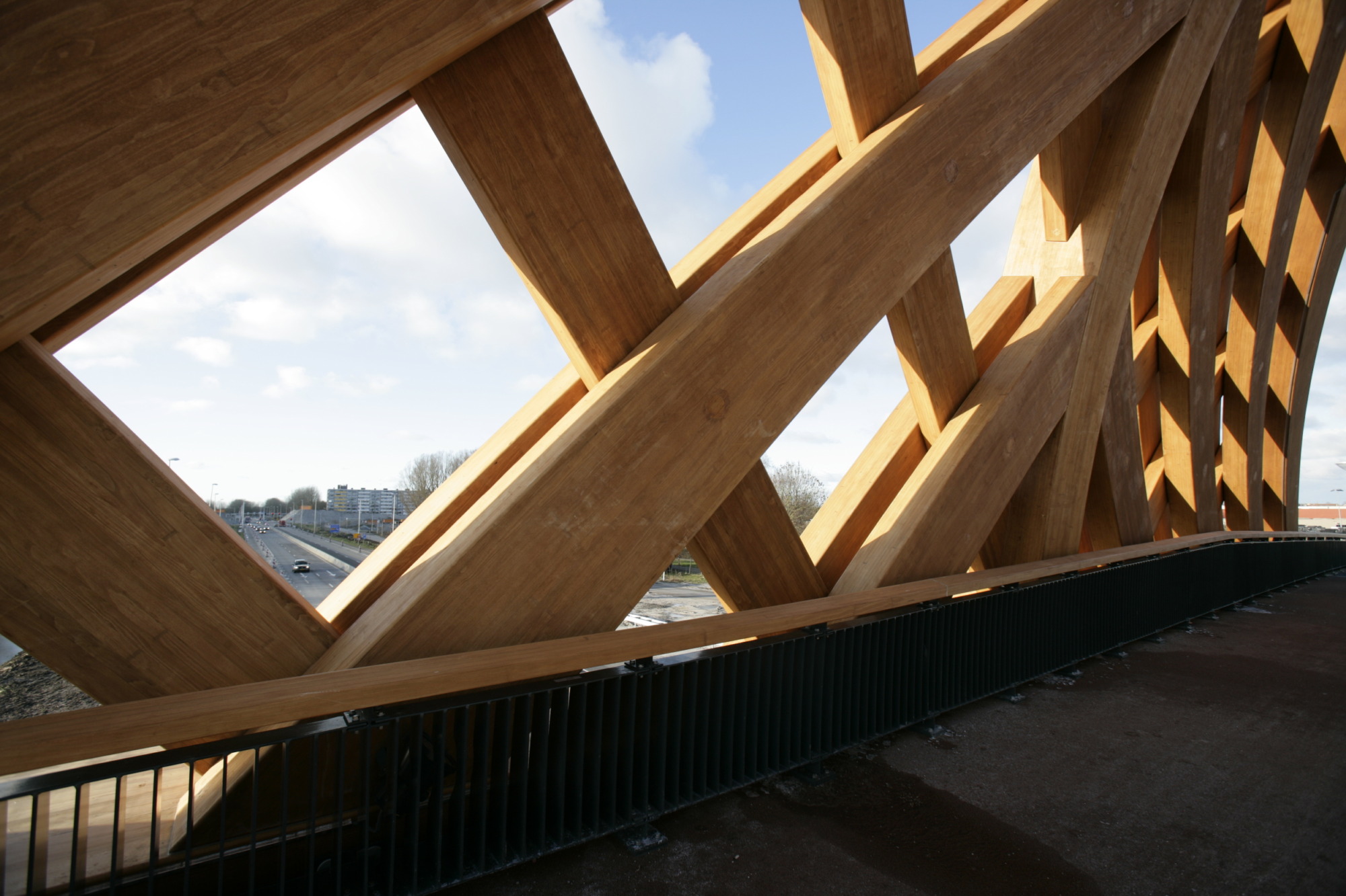 De beide houten vakwerken zijn voor de stabiliteit in het midden aan elkaar gekoppeld. Door de doorsnede van de brug voor het verkeer te optimaliseren, is de gekromde vorm ontstaan. Deze biedt samen met het driehoeks-vakwerk onverwachte perspectivische beelden op. Het bruggenhoofd aan de buitenwijk is een groen dijkelement; aan de binnenstad vormt deze een betonnen aanbrug die een vaarverbinding overbrugt.