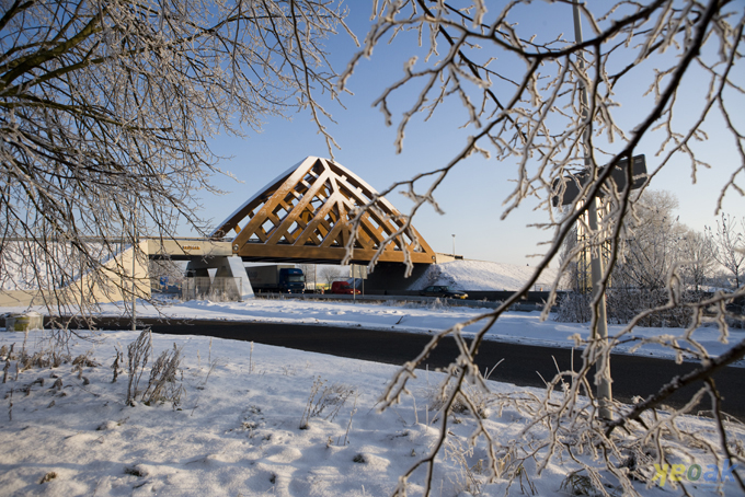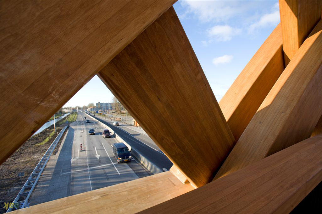 Het ontwerp van de brug is een versmelting van infrastructuur, constructie, kunst en architectuur. Als onderdeel van de vernieuwde A7 is de houten brug op twee posities bedacht. De tweede houten brug wordt in 2010 gerealiseerd. Het raakvlak van de A7 met de binnenstad wordt voor de automobilist op deze manier afgebakend. De brug is voor de automobilist op de snelweg een stadsmarkering. Voor de passant die de snelweg kruist een poort tussen binnenstad en buitenwijk. Naast autoverkeer maken ook voetgangers en fietsers gebruik van de brug.