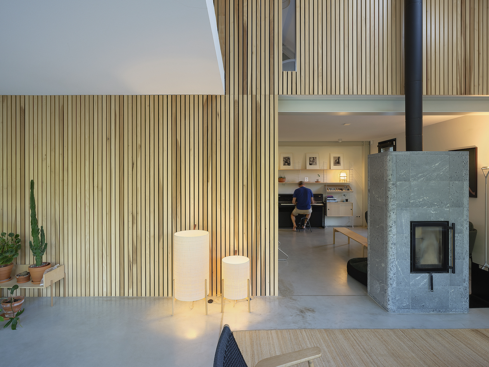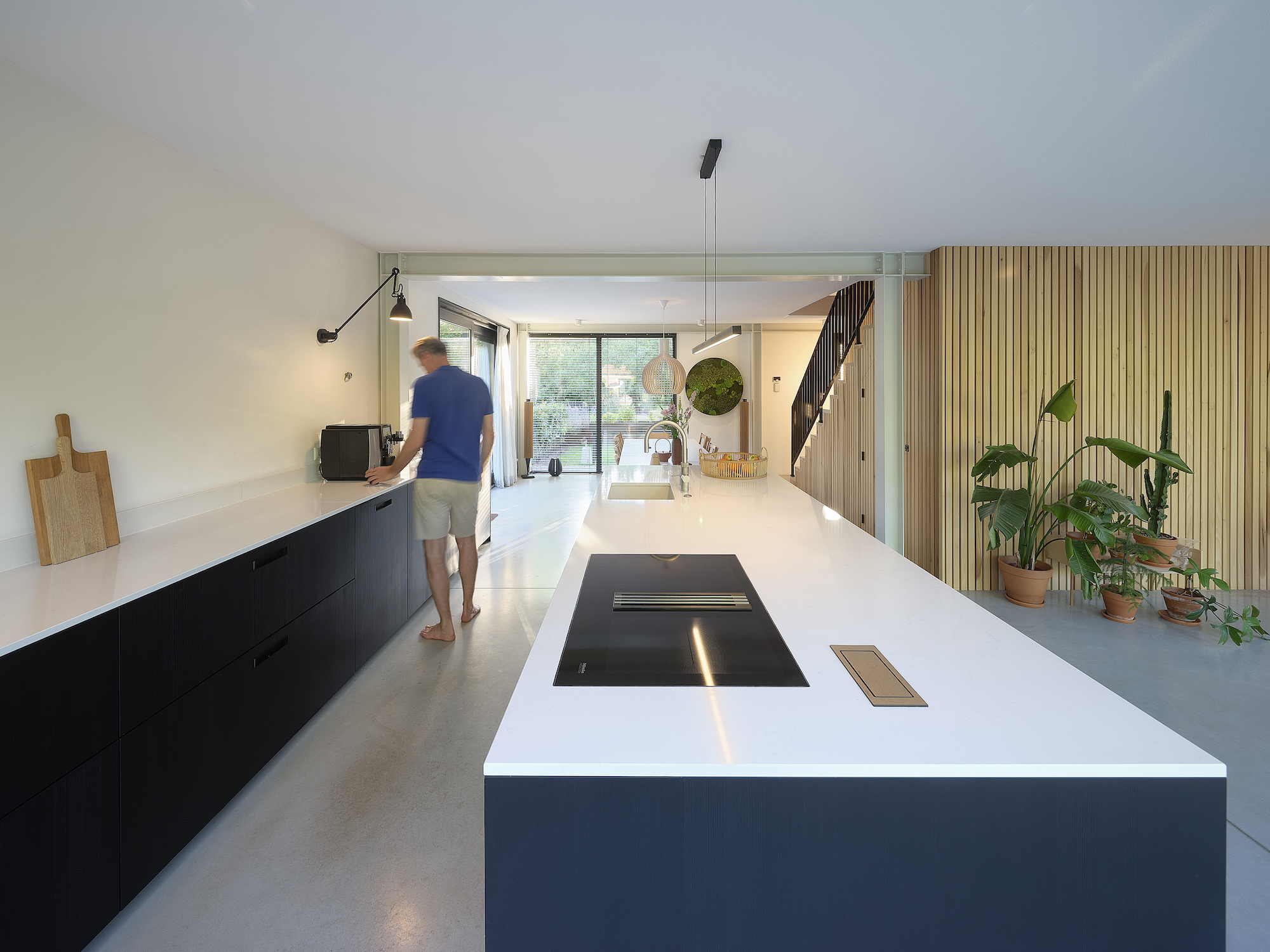 Door toepassing van horizontaal hout in de puien worden schuurdeuren nagebootst. De kopgevel aan de straatzijde is redelijk gesloten, terwijl de achterzijde, gelegen aan de rivier de EE over de volledige breedte open is. Op de naastgelegen berging zijn zonnepanelen geplaats en de woning wordt verwarmd door een luchtwarmtepomp.