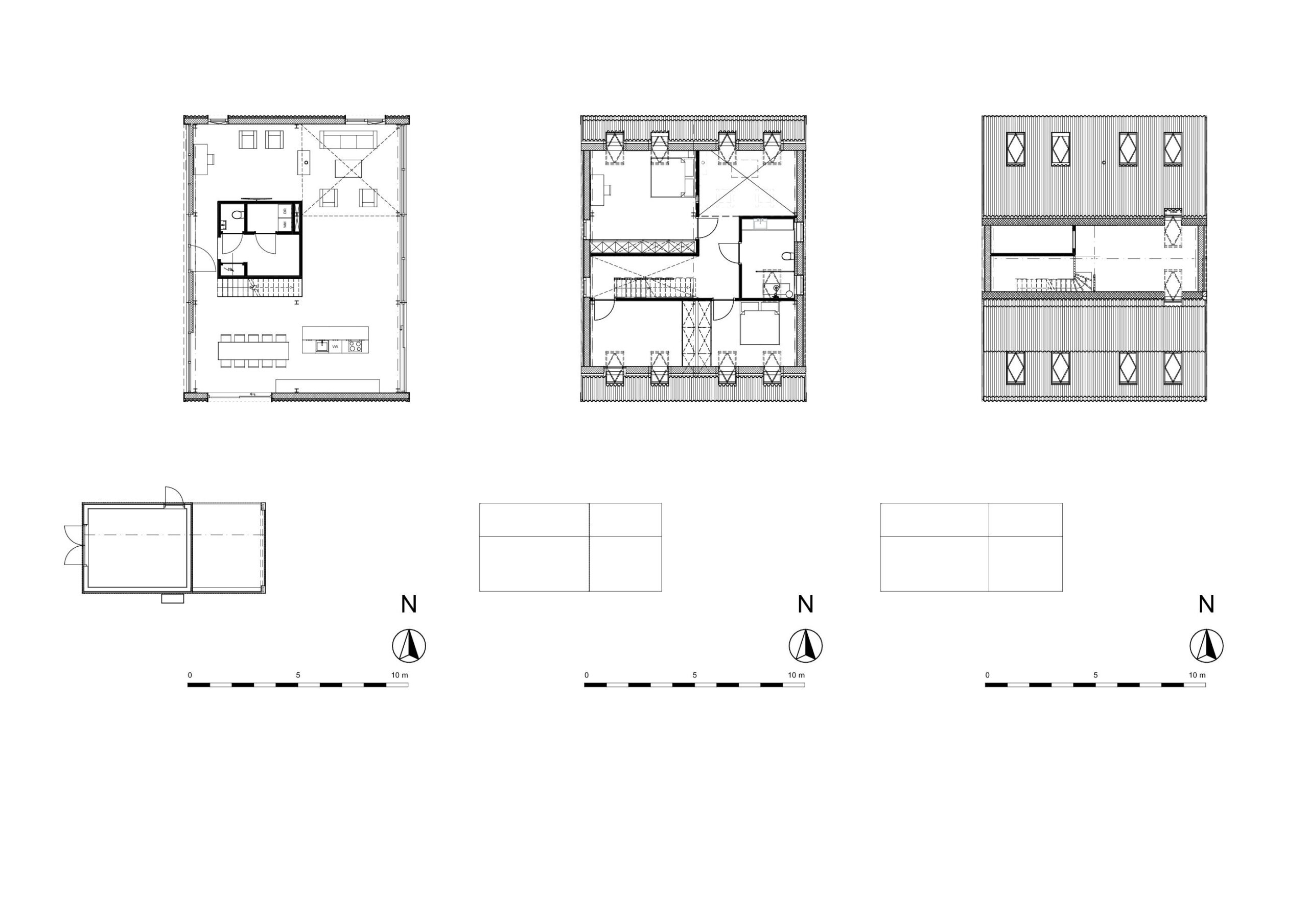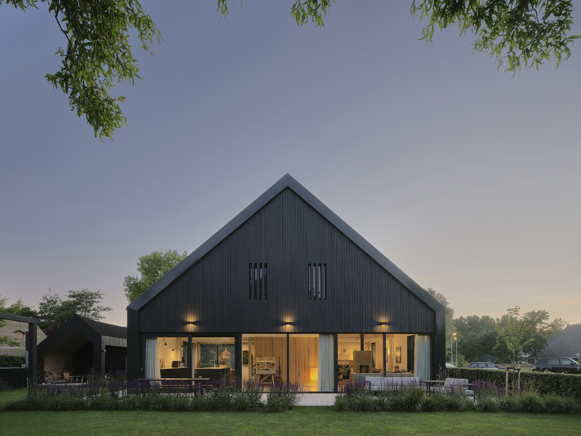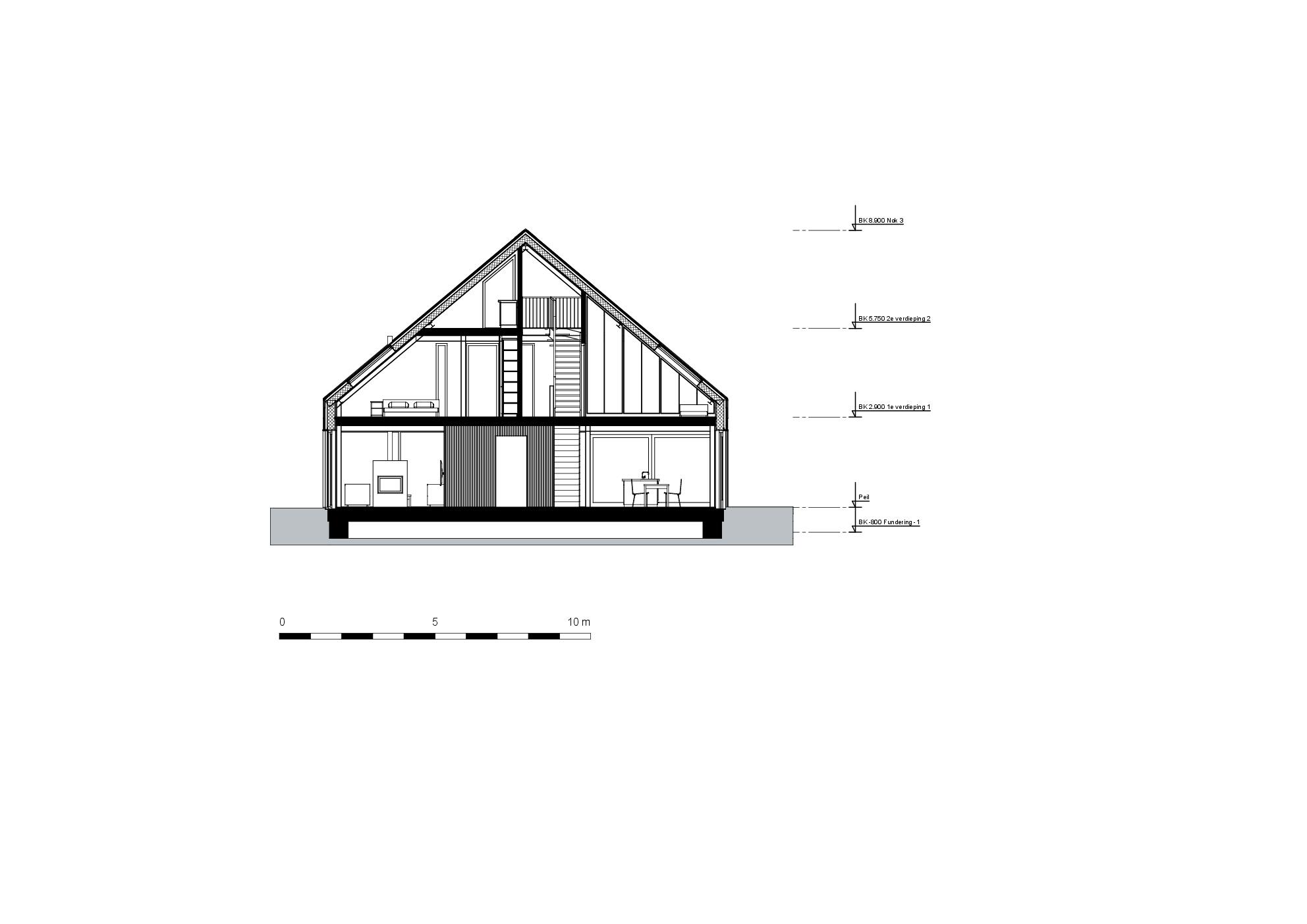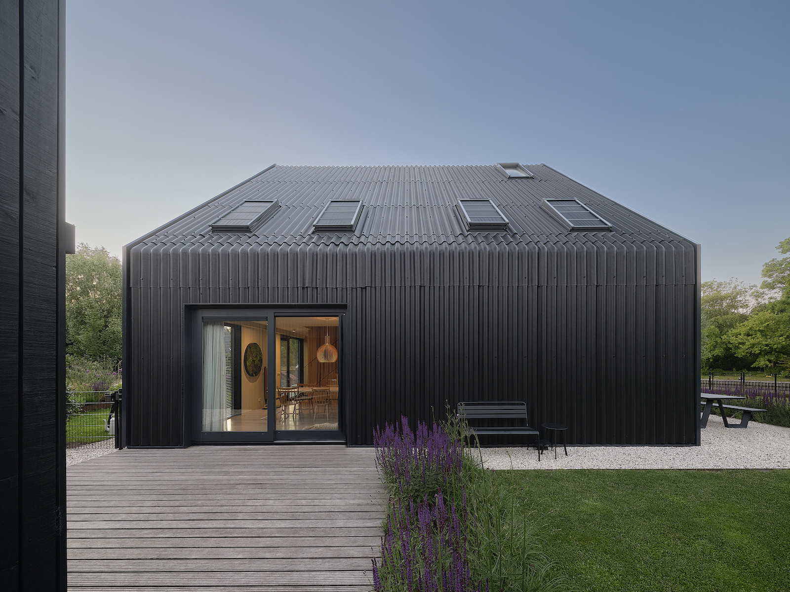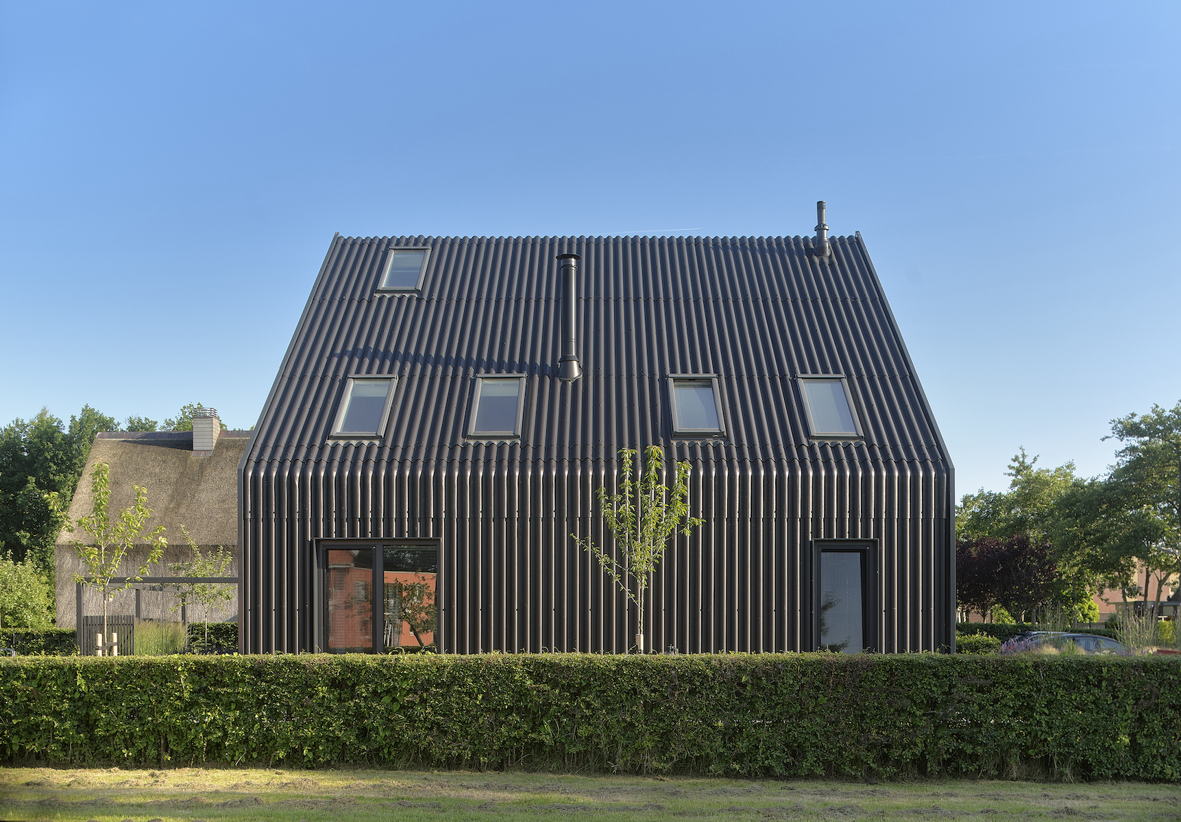 Kenmerken van een schuur zijn aanwezig in de woning: een golfplaten dak dat doorloopt tot aan het maaiveld. Regenwater wordt opgevangen in een grindstrook. De kopgevels zijn aan de onderzijde zo transparant mogelijk, aan de bovenzijde blijven ze zo veel mogelijk gesloten.