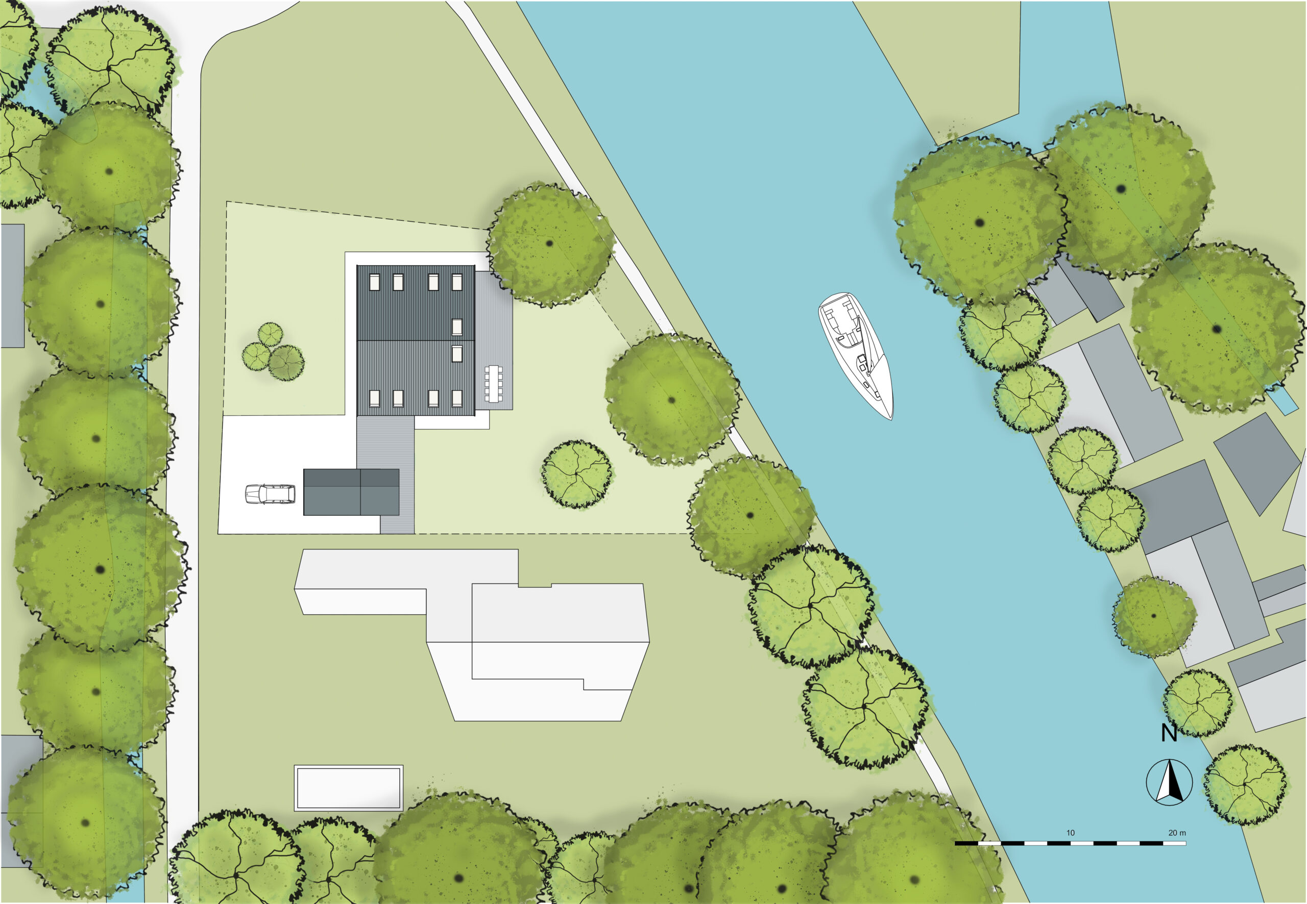 Het ontwerp van de woning is geïnspireerd op de botenhuizen langs de rivier de EE en de schuren aan het water. Deze woning is een toonbeeld van efficiënt ontwerp waarbij zoveel mogelijk prefab elementen en bouwmaterialen zijn gebruikt. Daardoor is er zeer weinig afval geproduceerd en verliep de bouw op locatie relatief snel.