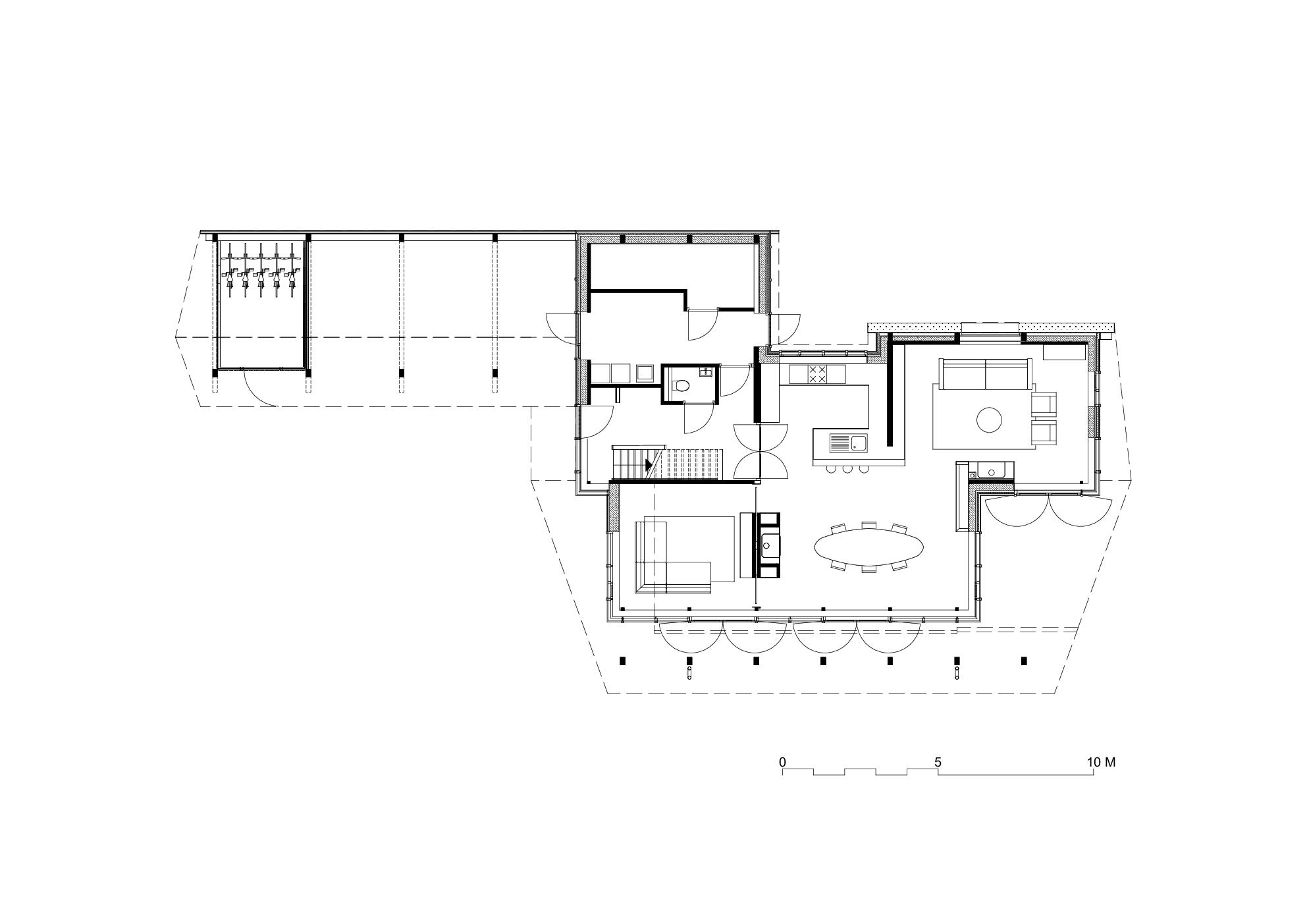 De zuidzijde van de woning is open en biedt een prachtig uitzicht op de omgeving. De veranda op het zuiden zorgt voor een natuurlijke koeling in de zomer en biedt schaduw. Het vele glas aan deze zijde zorgt bovendien voor een optimale benutting van zonnewarmte in de winter. Aan de noordzijde van de woning is gezorgd voor privacy en rust, terwijl de tuinen rondom de woning sober en zorgvuldig zijn vormgegeven, passend bij de architectuur van de woning.