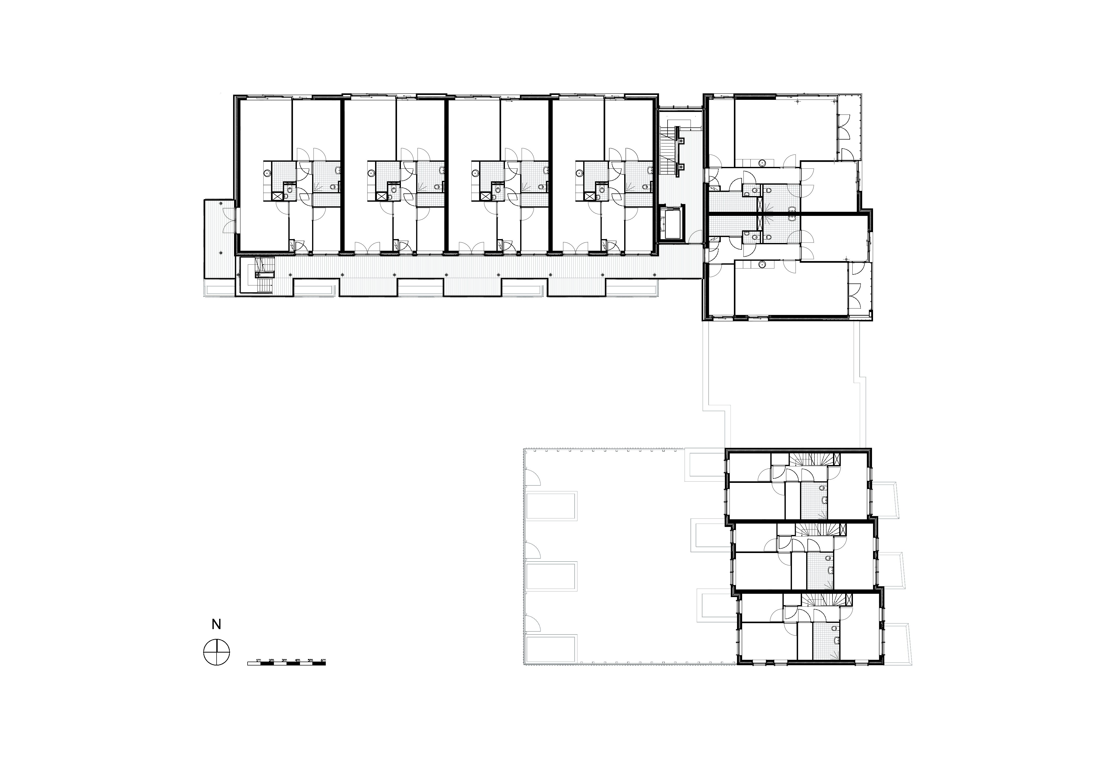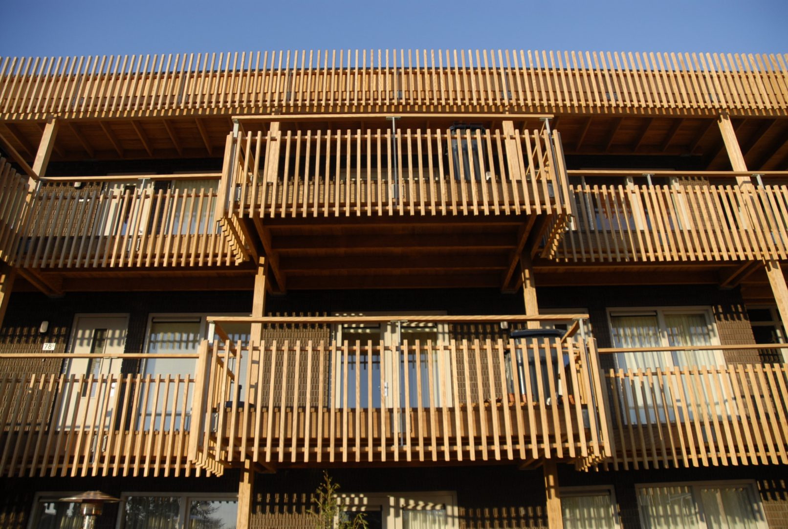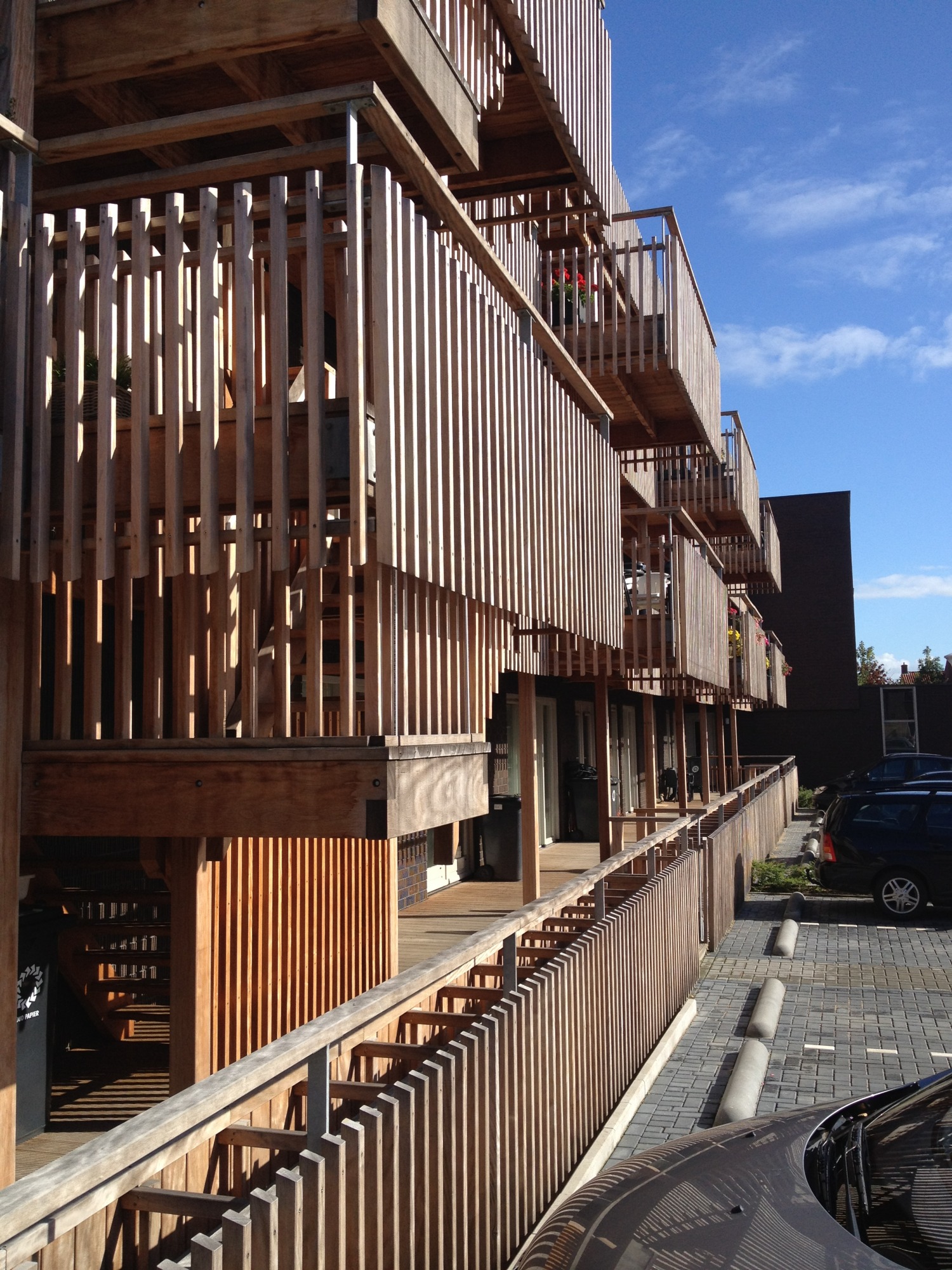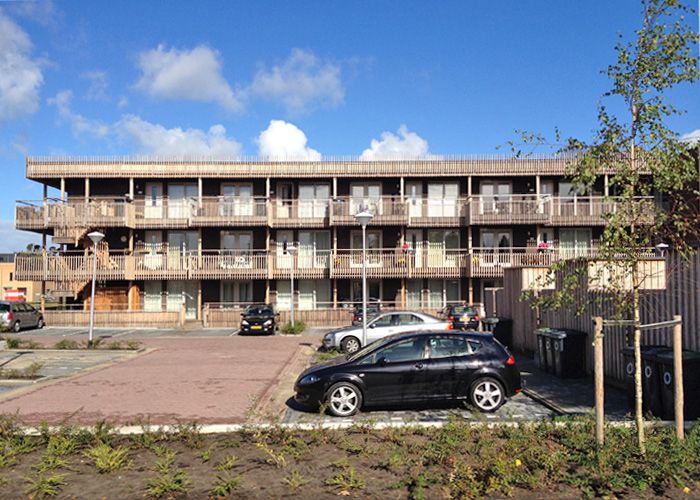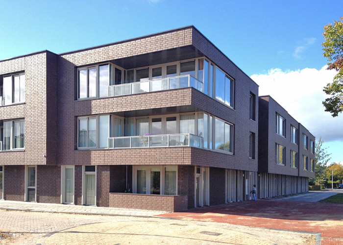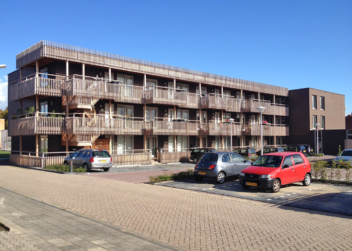 Bij de vormgeving van de achterzijde van de galeriewoningen is goed nagedacht, wat de woonkwaliteit van het achtergebied ten goede komt. Het imago van de achterkant is op logistiek gebied bewust kalm en helder gehouden. We hebben gekozen voor doorschijnende typologieën, zowel gericht op het centrale park als op de zonzijde aan de achterzijde. Hier zijn ook de appartementen toegankelijk voor verbrede galerijen met balkons. Deze balkons aan de zuidzijde zijn groot en hebben daardoor een prettige woonkwaliteit en zijn daarmee een meerwaarde voor de buurt achter het gebouw. Deze buitenruimtes zijn opgetild waardoor men uitkijkt over de geparkeerde auto’s. Het appartementengebouw Vlasakkers telt 3 verdiepingen.
