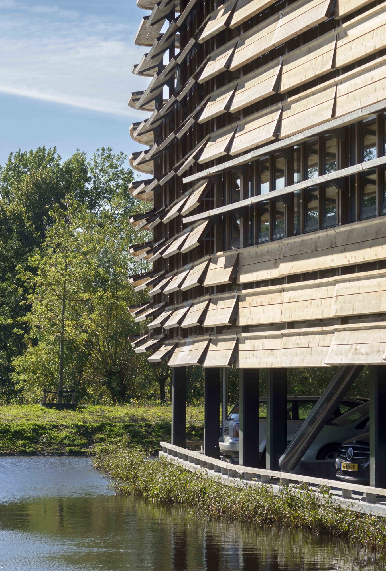 Doordat het gebouw wordt opgetild, lijkt het landschap er onderdoor te lopen. De eerste gebouwlaag opent zich op drie prominente plekken en biedt zicht op het lichte interieur. Het golvende verloop van de houten zonweringslamellen die het gebouw volledig omvatten, geeft het gebouw door de vloeiende, continue en afgeronde vormen, een haast vloeibare uitstraling. Hierdoor is het herkenbaar als boegbeeld van de WaterCampus.