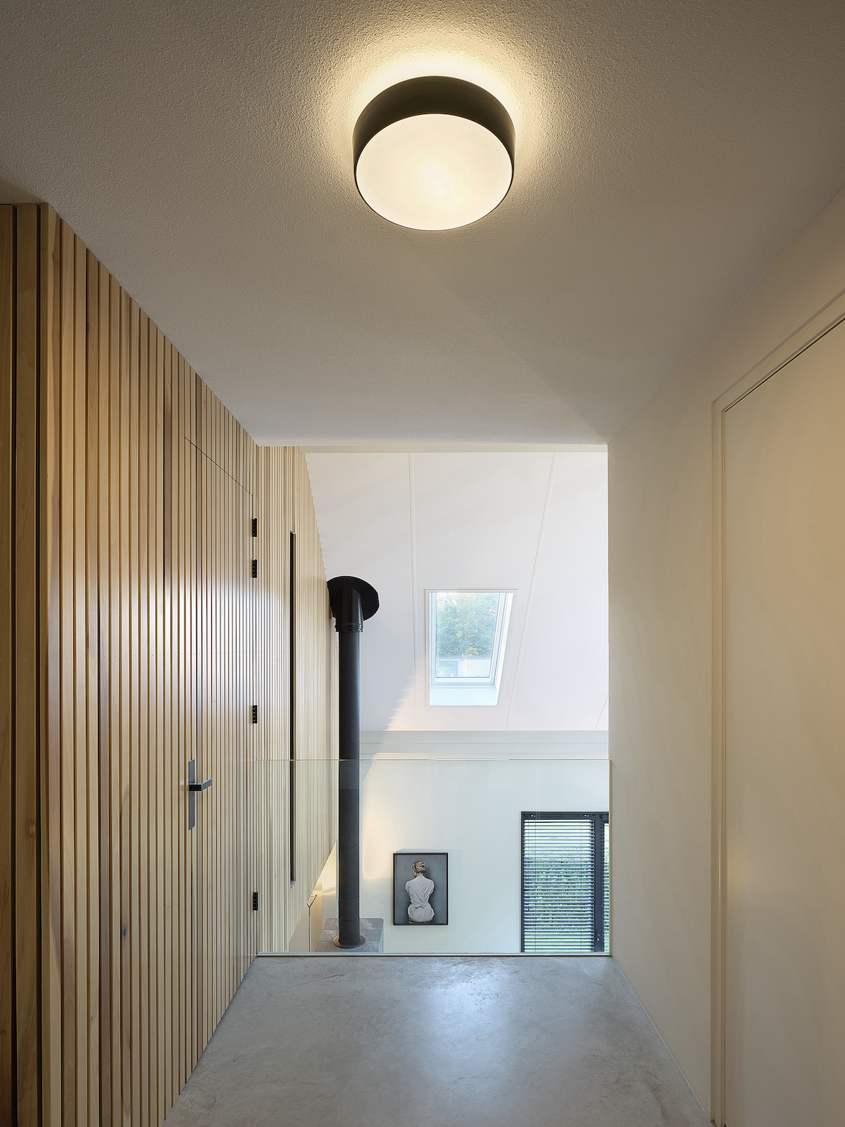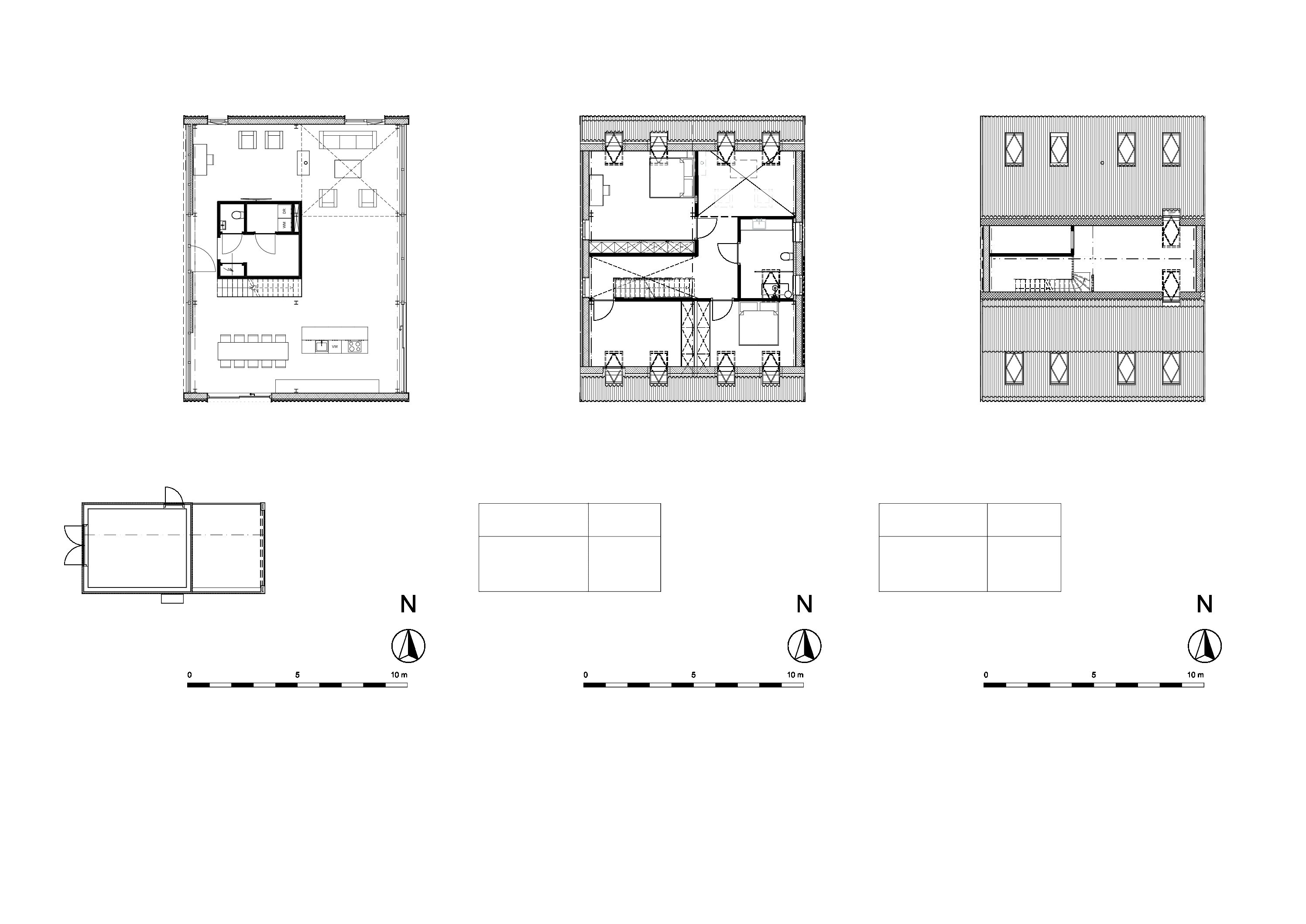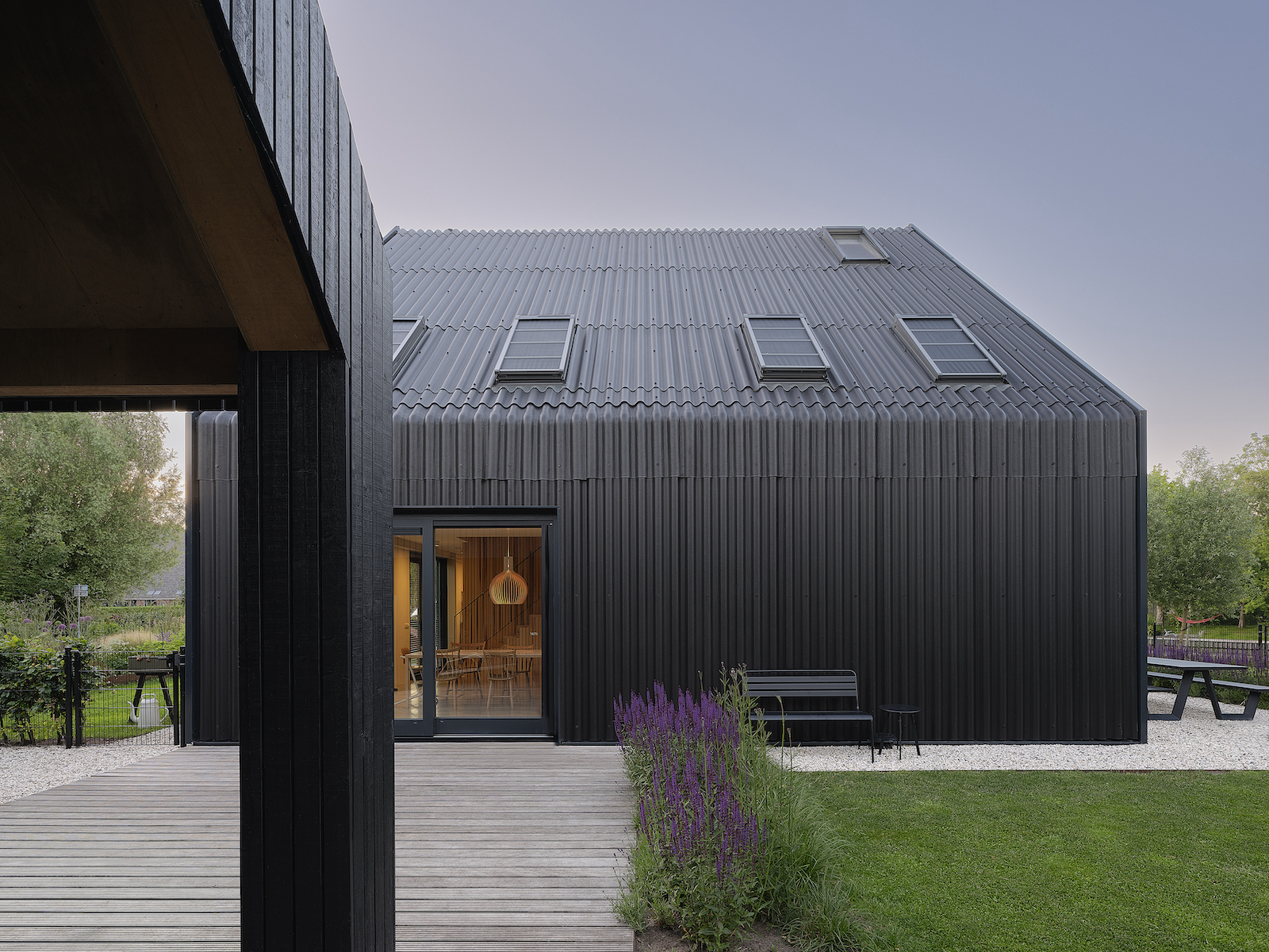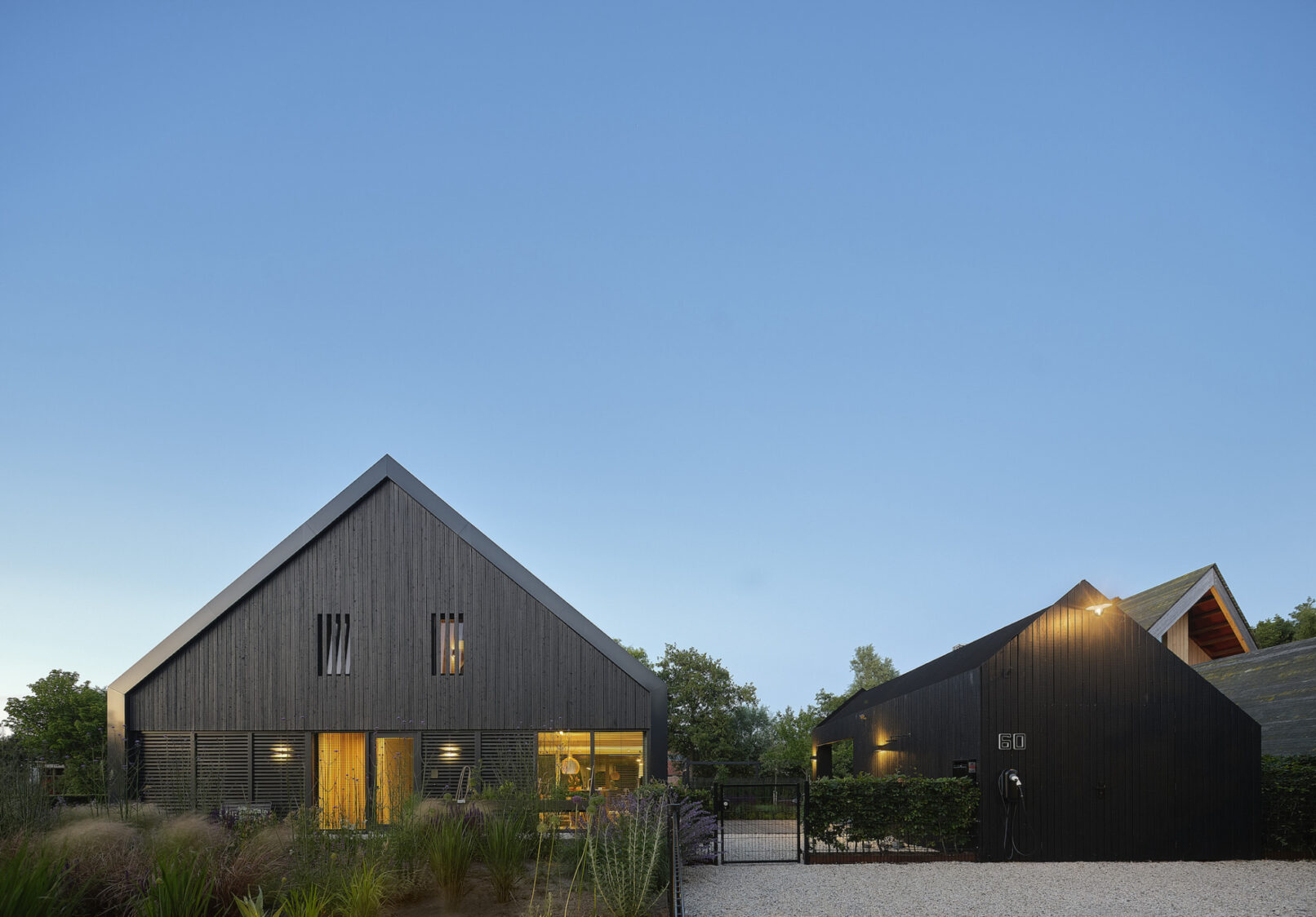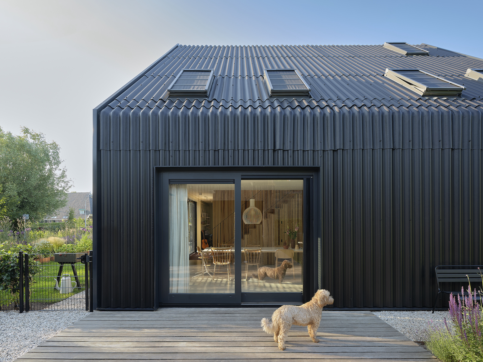 Kenmerken van een schuur zijn aanwezig in de woning: een golfplaten dak dat doorloopt tot aan het maaiveld. Regenwater wordt opgevangen in een grindstrook. De kopgevels zijn aan de onderzijde zo transparant mogelijk, aan de bovenzijde blijven ze zo veel mogelijk gesloten.