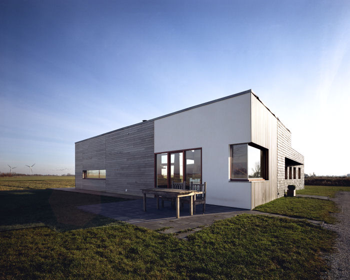 De opbouw vanuit het landschap is vormgegeven door afwisselende hoogtes van de verblijfsruimtes en verschillen in het peil. In het interieur zijn deze bewegingen voelbaar en herkenbaar. De woonkamer ligt als belangrijkste leefruimte hoger dan de rest. Hier opent de woning zich ook naar het weidelandschap door een lichte verdraaiing van het volume. Sterk horizontale gevelopeningen maken het landschap als een panorama zichtbaar vanaf de bank of vanuit bed, terwijl inkijk nooit gevoeld wordt. Zo lijkt het alsof je kijkt naar een landschapsstuk in plaats van naar buiten.