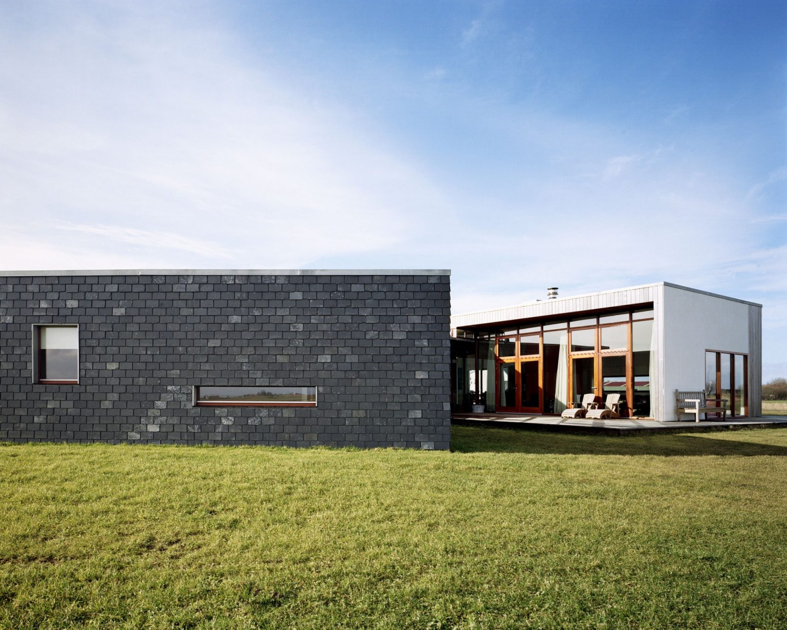 Materiaalovergangen zijn zo vlak mogelijk en met grote precisie uitgevoerd. Staal, glas en wit pleisterwerk worden in eenzelfde gevelvlak gecombineerd met natuurlijke materialen als Afrikaanse leien en hout. Hoekafwerkingen zijn detailloos. Soms liggen vensters sterk terug, zodat juist aan de binnenzijde gladde wanden ontstaan en de buitengevel spannender wordt. Door het materiaalgebruik valt de woning vrijwel weg in het landschap.